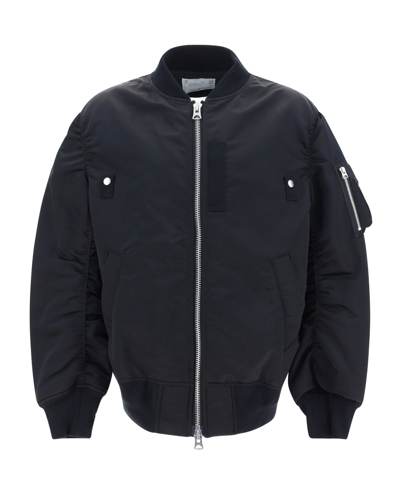 Bomber jacket by sacai, double-slider front zipper closure, high ribbed elasticized crew neck, elasticized cuffs, monochrome pattern, one patch pocket on sleeve, elasticized hem, two side welt pockets, side panels adjustable by snap buttons, regular fit.