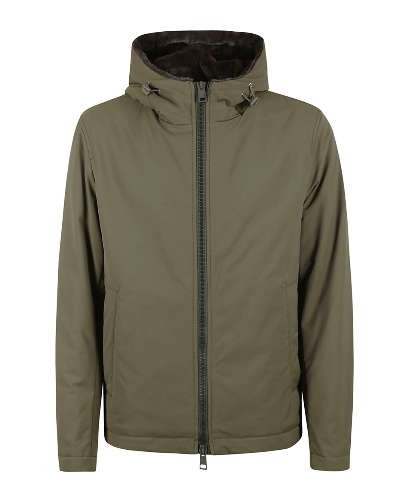 Herno padded jacket with adjustable hood. Tecnique fabric, green color, double slider zip, side pockets with zip, drawsting at waist, logo detail on the hood. Composition: 100% Polyestere