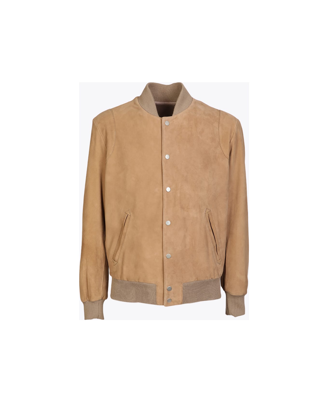 Beige suede bomber jacket with snaps closure. Rib-knitted collar, cuffs and bottom hem. Two side pockets. Regular fit. Composition: 100% leather. Made in Italy.