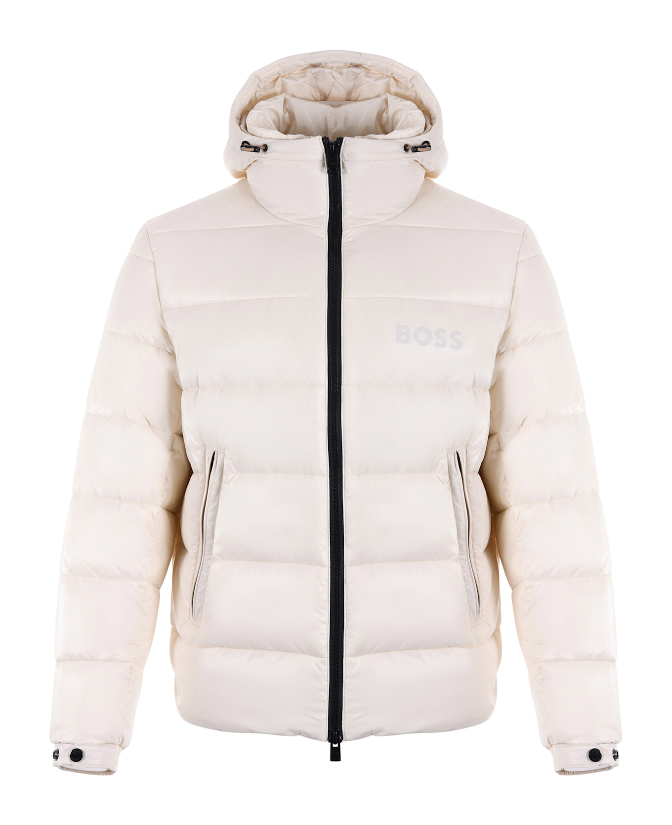 Boss quilted nylon down jacket. Padded. Drawstring hood. Zip pockets. Inner pocket. Contrasting double slider zip closure. Adjustable cuffs. Maxi logo on the front in tone. Drawstring at the bottom. Size in photo M 100% polyamide Padding: 100% polyester