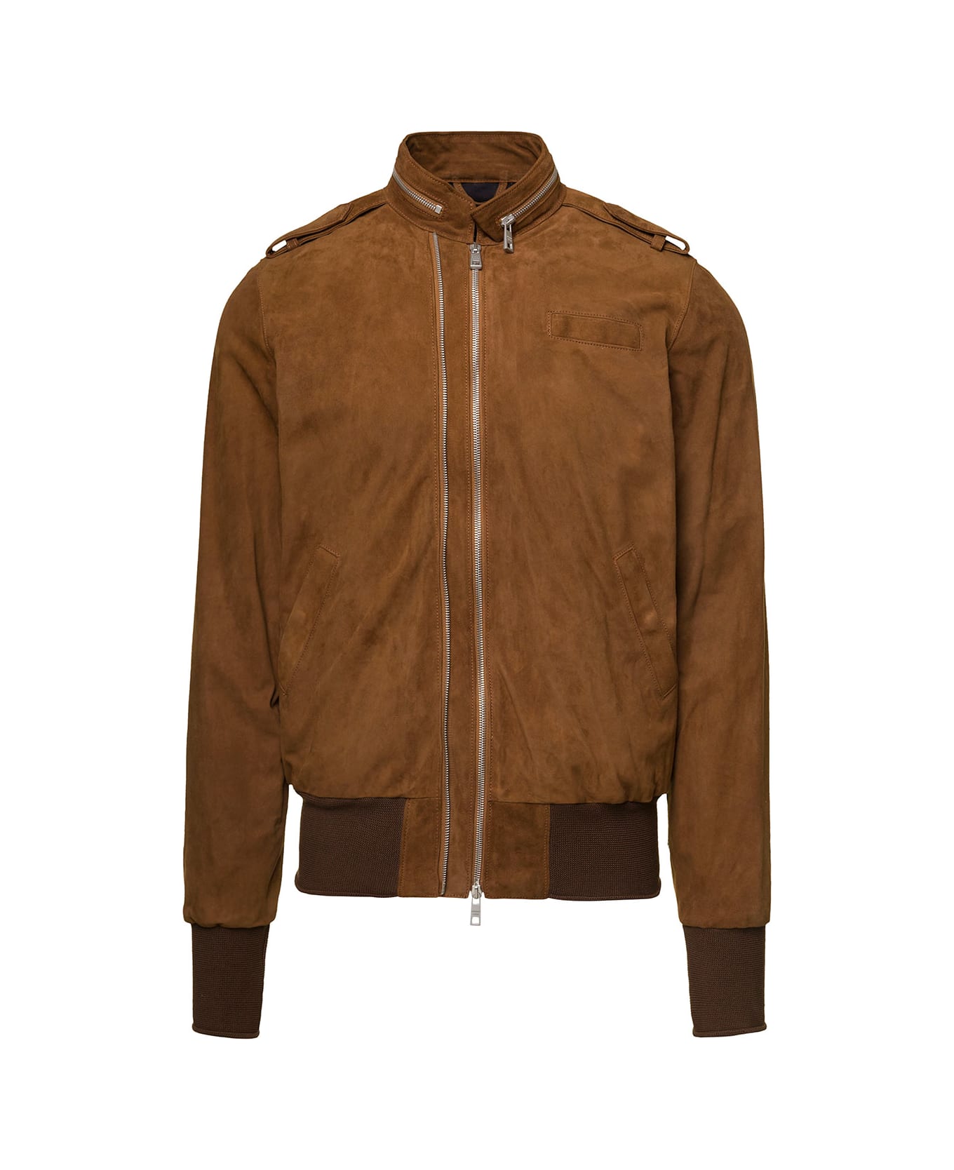 Jacket High-neck with zip Epaulettes Long sleeves with high cuffs Front fastening with two-way zip One chest welt pocket Two front oblique pockets Elasticated inserts Brown Suede Regular fit