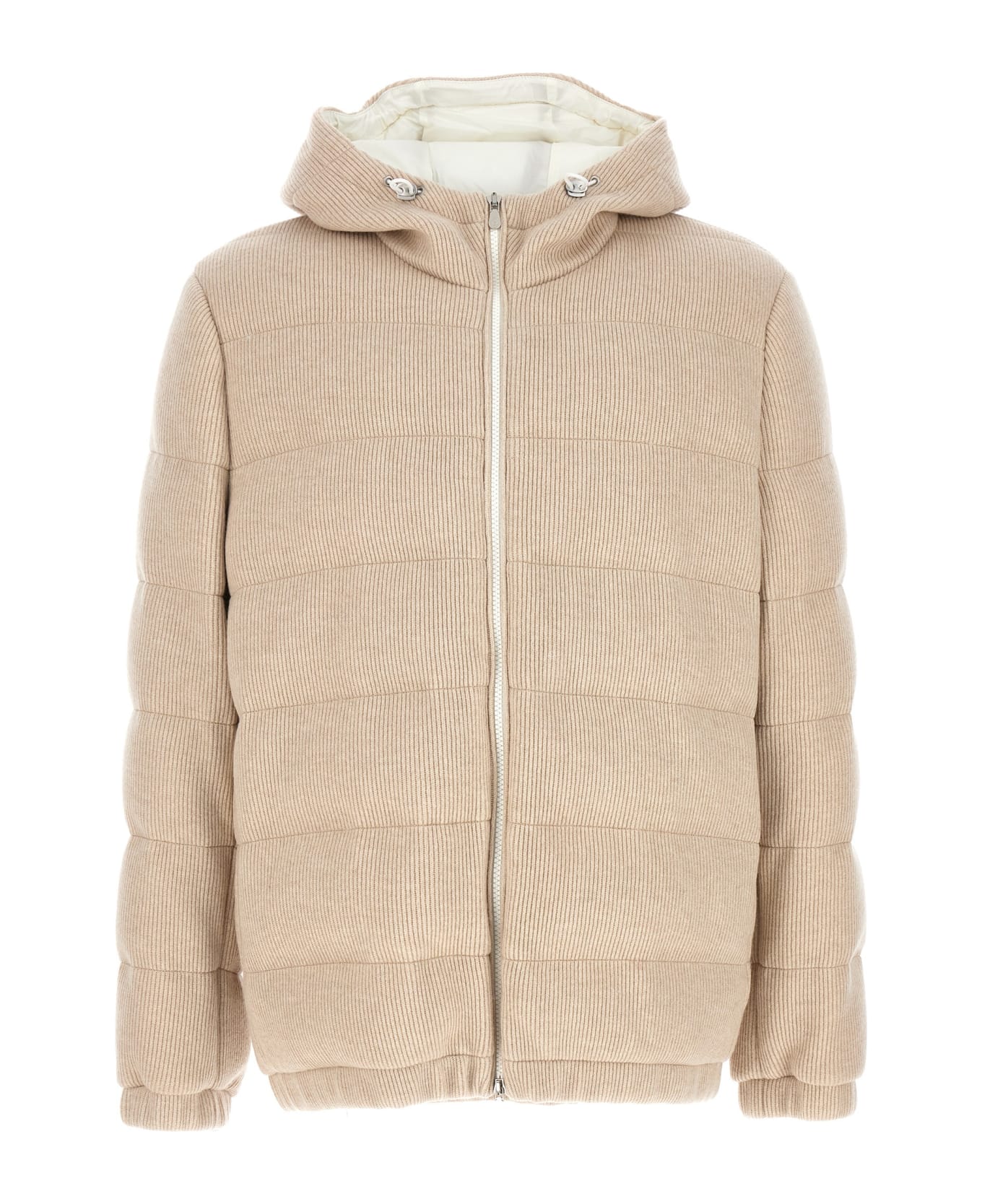 Hooded cashmere puffer jacket, featuring goose down padding, a zip closure, pockets, and long cuffed sleeves with elastic. Composition: 100% cachemire