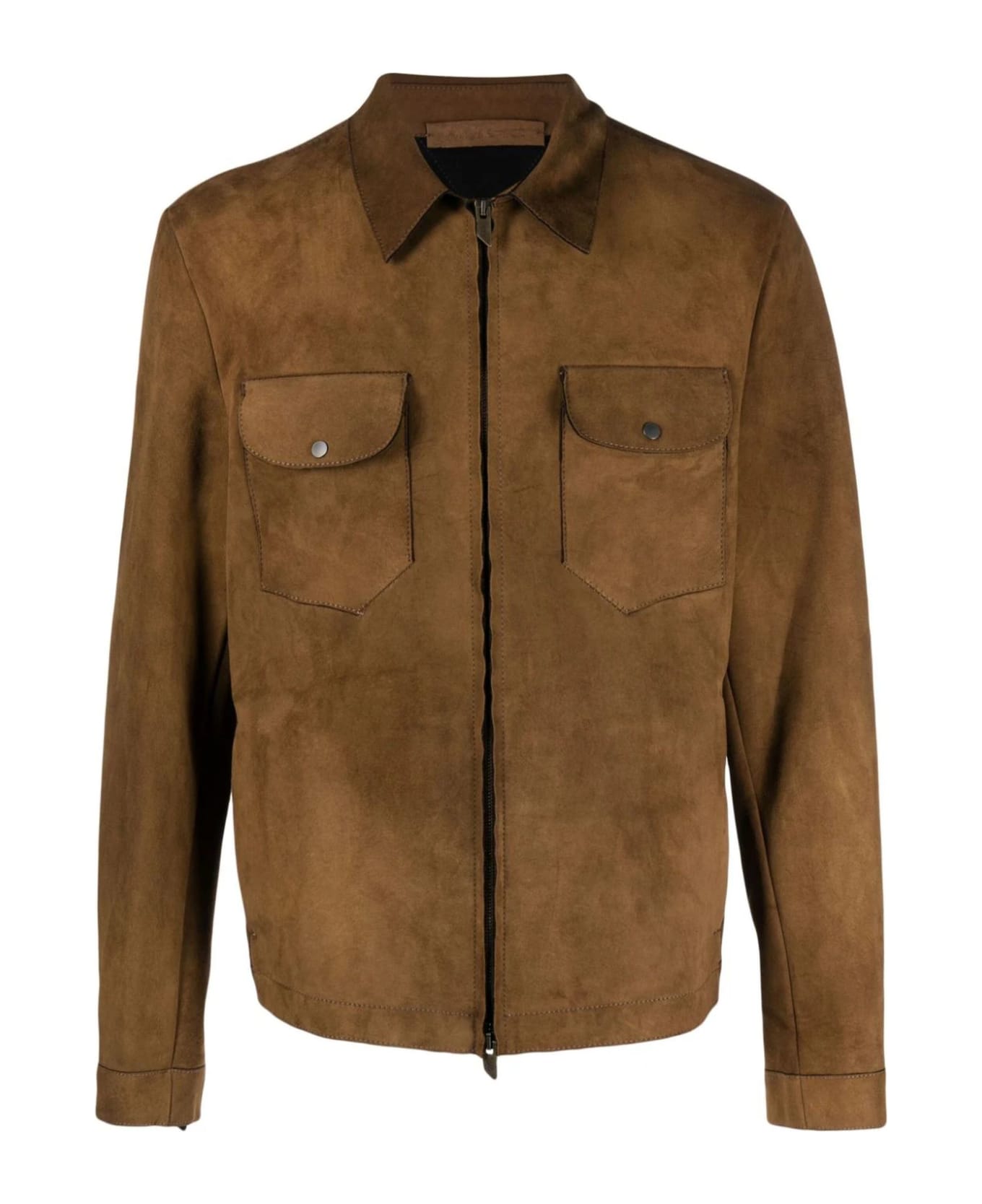 Camel brown sheep suede jacket, logo plaque, classic collar, front two-way zip fastening, long sleeves, cuff zips, two chest flap pockets, straight hem, cotton blend lining