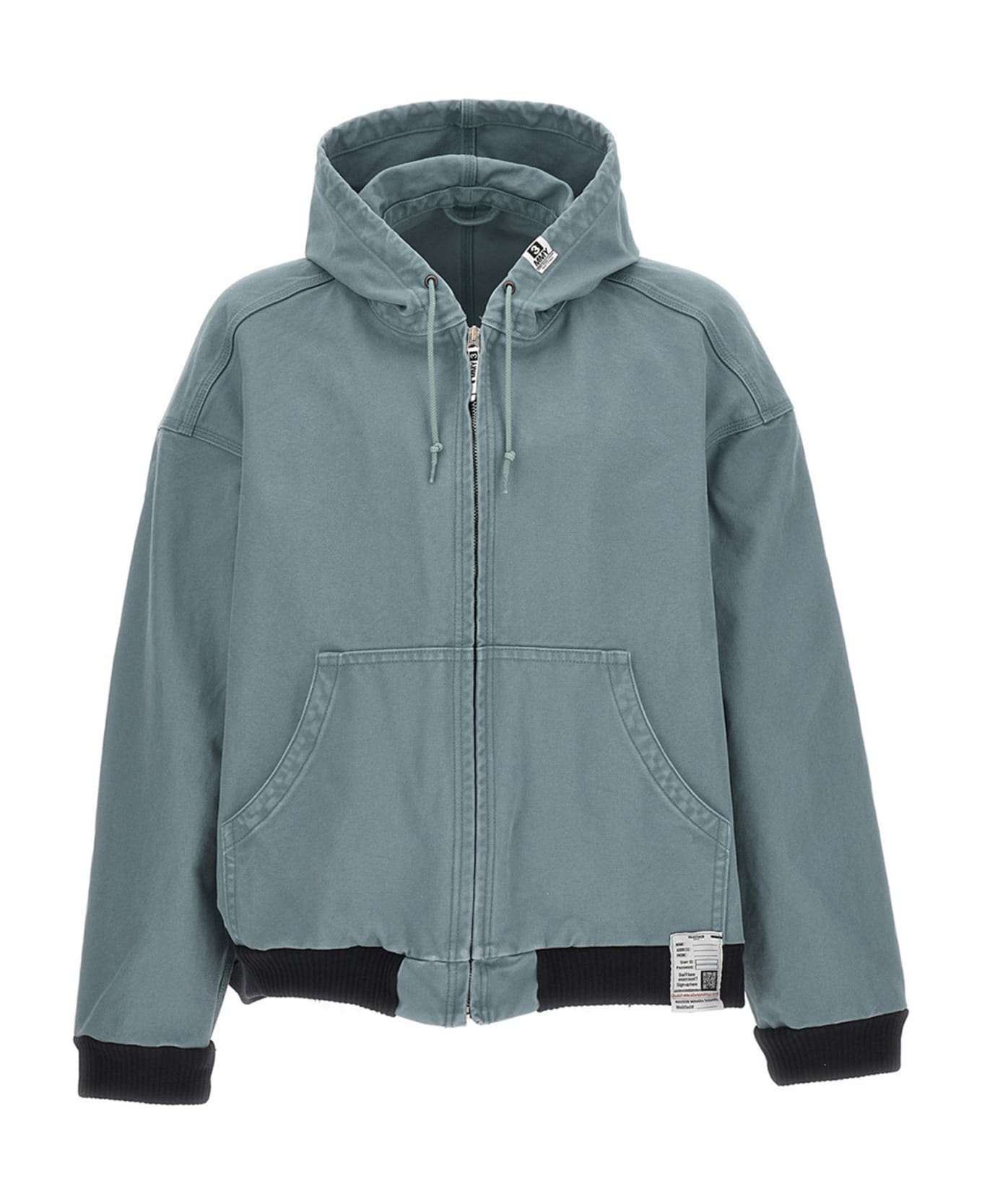 Cotton canvas hooded jacket with zip closure, pockets, and long knitted cuffed sleeves.