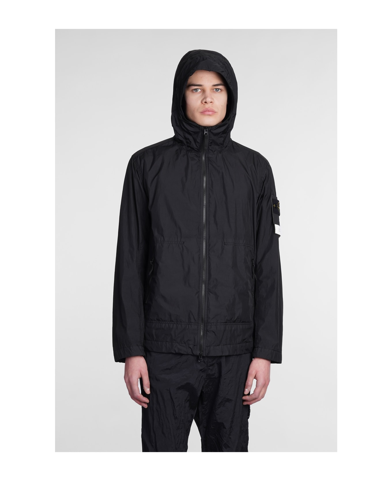 Casual jacket in black polyamide, hood, long sleeves, ribbed cuffs and bottom, pockets, zip clousure, patch logo on sleeve, 100% polyamide, Model is 1. 83 and wears size S, Made in Indonesia