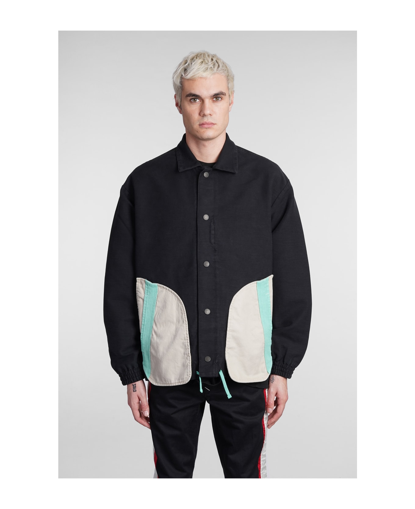 Casual jacket in black polyester, collar, frontal buttoning, long sleeves, coulisse closure, pockets on side, 100% cotton, Made in Italy, Model is 1. 83 and wears size M