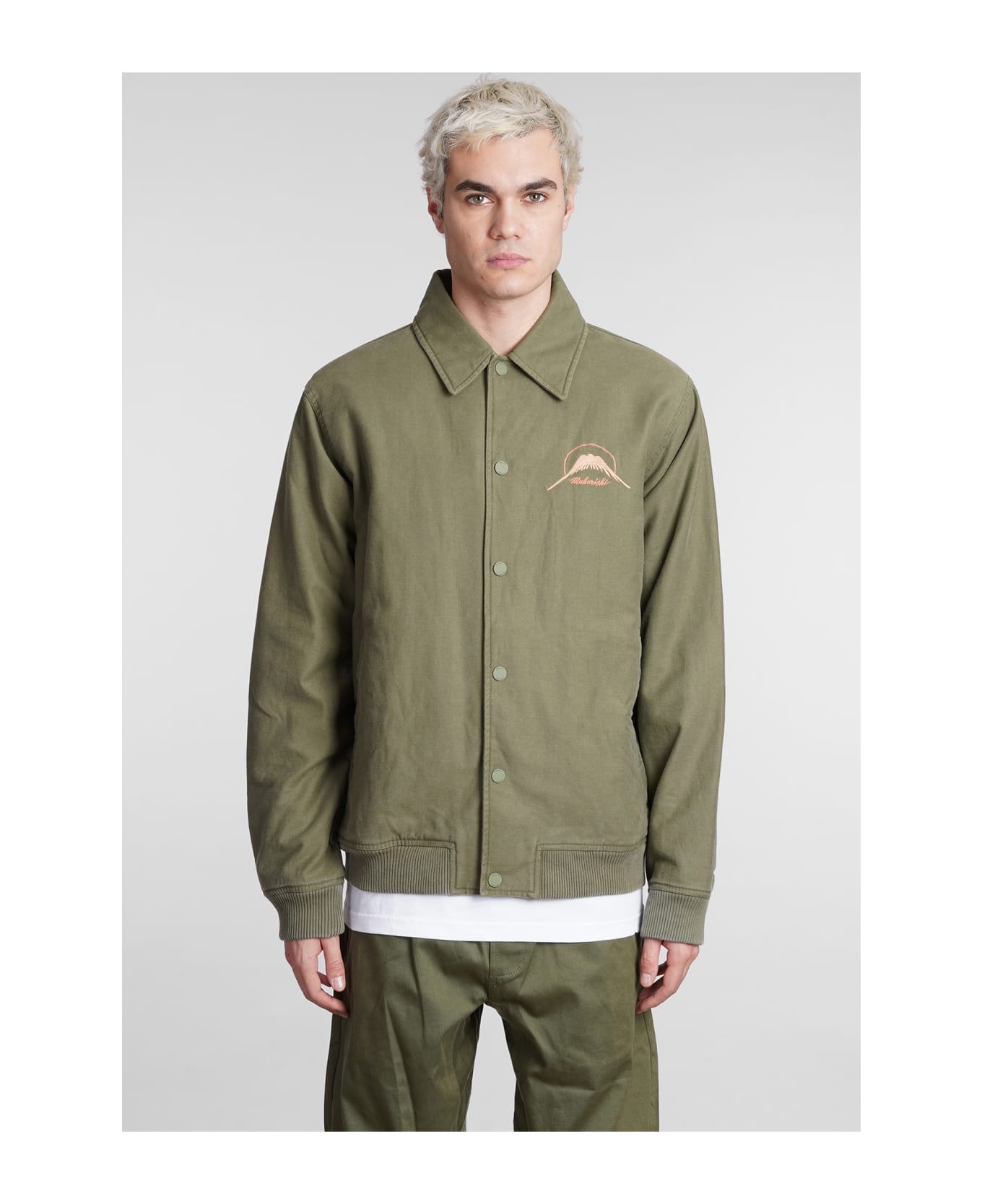 Casual jacket in green cotton, collar, long sleeves, frontal buttoning, pockets on side, logo on chest, back embroidery, 100% cotton, Model is 183 cm and wears a size L