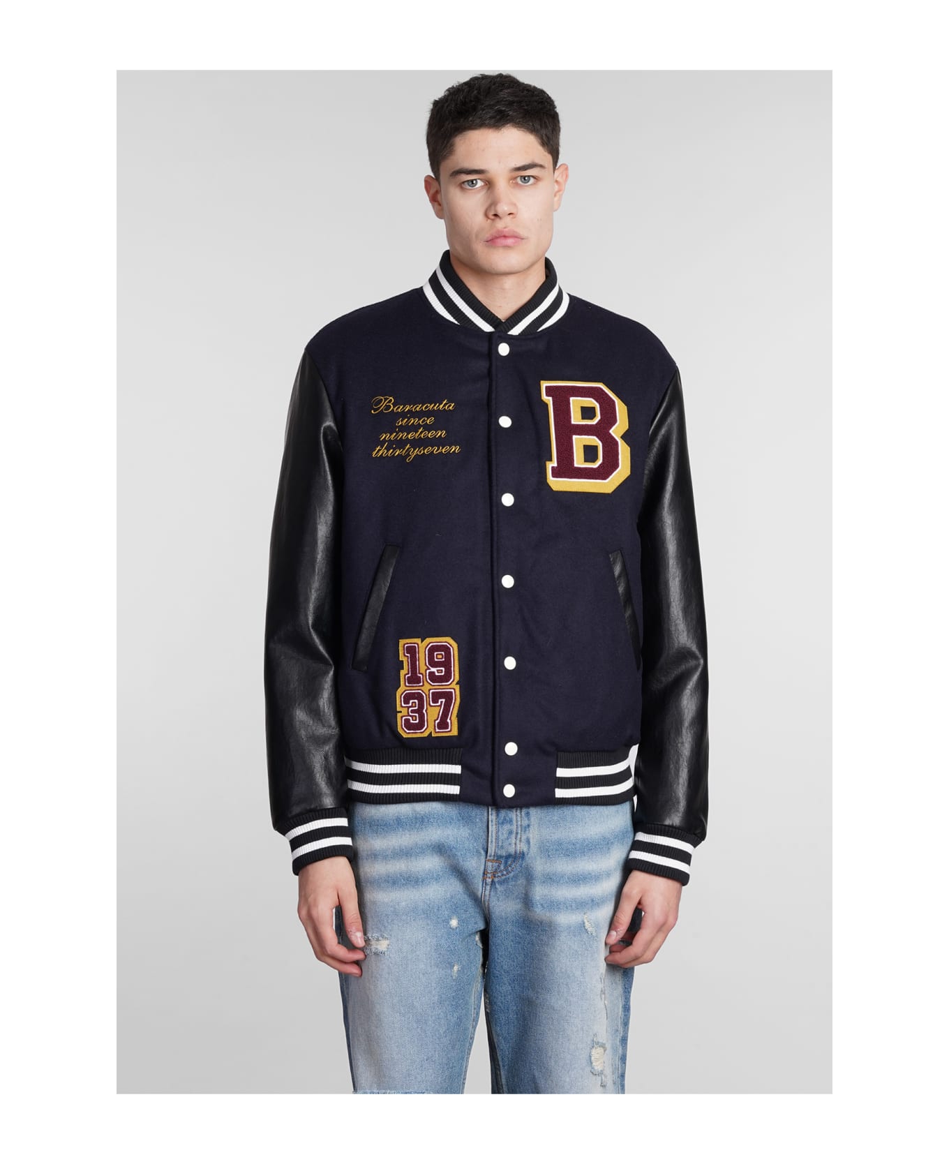 Bomber in blue wool, bomber collar, mesh sleeves, frontal buttoning, ribbed cuffs and bottom, contrast hem, logo patch, pockets, 80% wool, 20% polyester, Model is 1. 83 and wears size 46