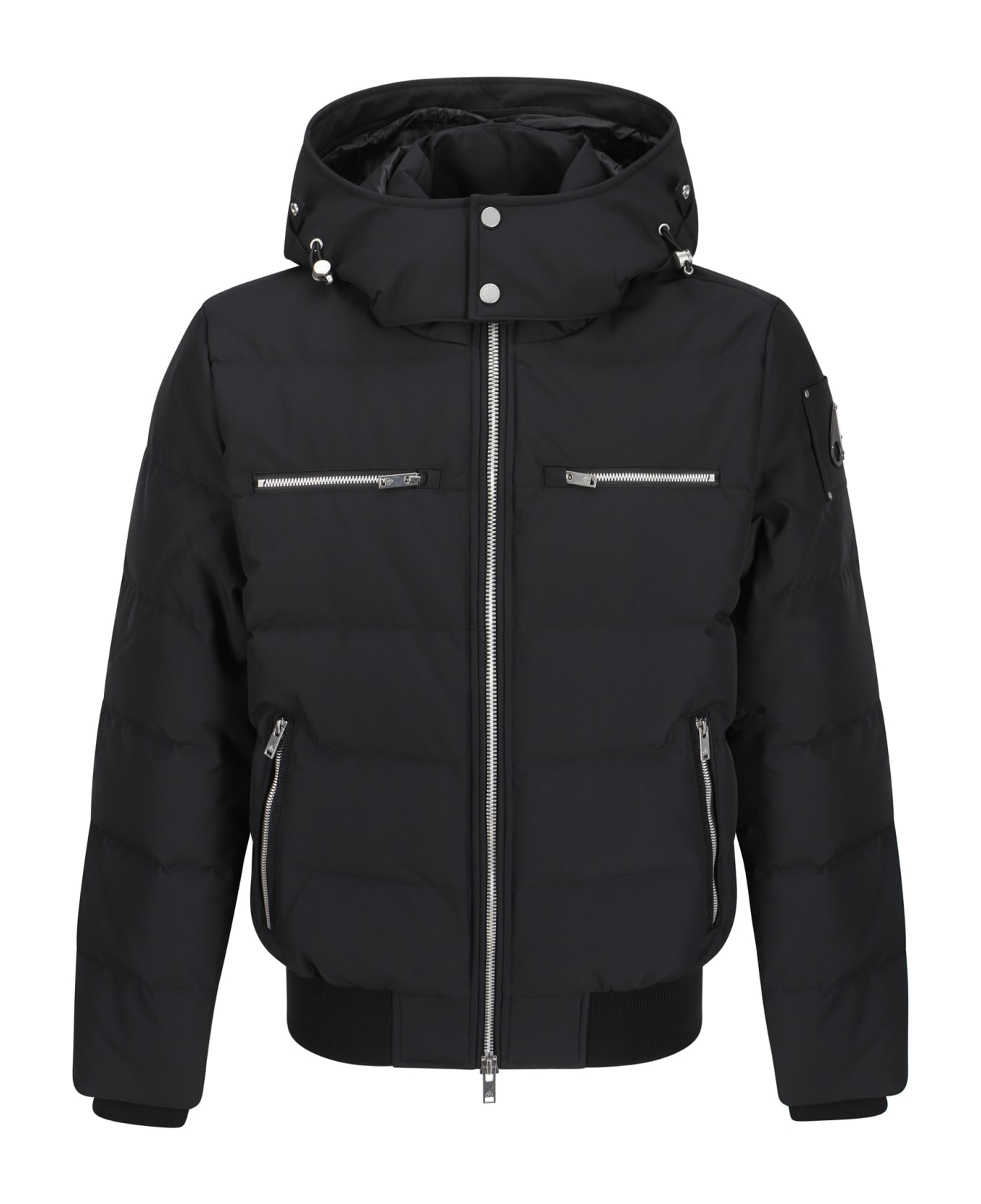 Cloud neoshear down jacket by moose knuckles, high-neck model with removable and adjustable drawstring hood, front closure by double-slider zipper, two zippered side welt pockets, two zippered front welt pockets, elasticized hem, brand's iconic logo patch appliquéd on sleeve, quilted and all-over padded design.