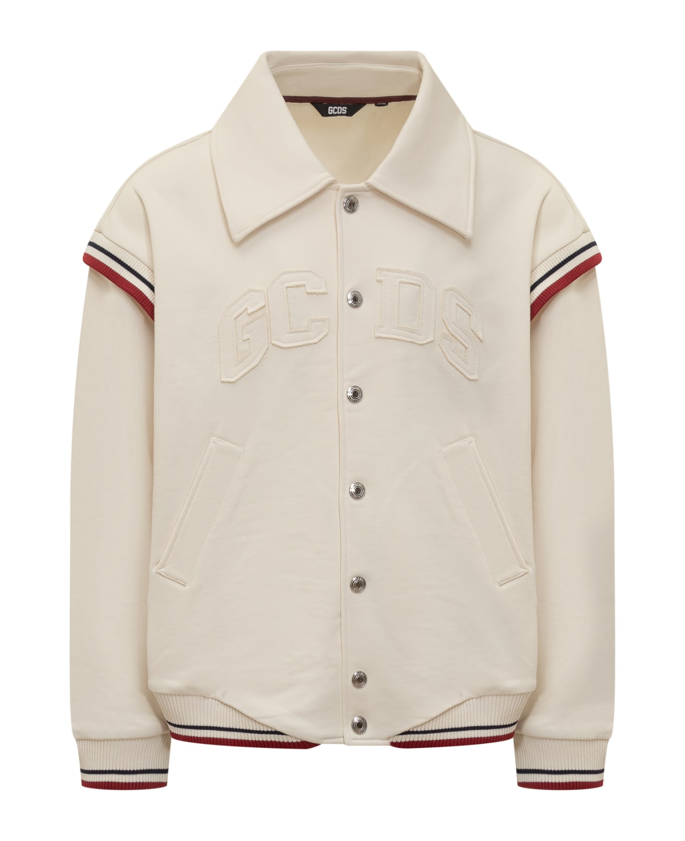 Bomber jacket with collar. Long sleeves and elasticated cuffs. Hip welt pockets and reapplied 'GCDS Lounge' logo embroidery. Striped hems with ribbing. Front fastening with logoed press studs.