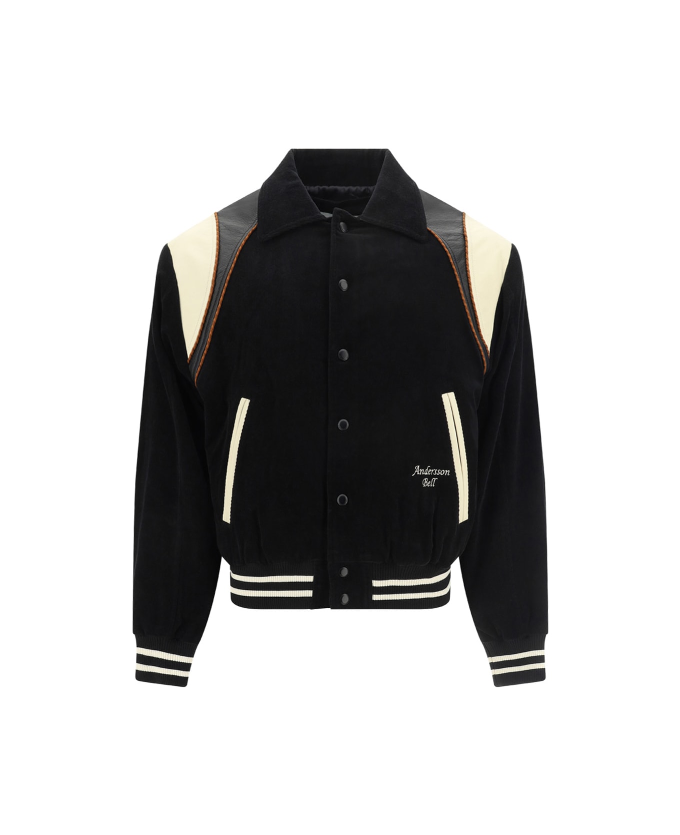Cotton college jacket by andersson bell, matching front button closure, classic ribbed collar, ribbed cuffs, two side slit pockets, ribbed hem with contrast detailing, iconic brand monogram embroidered on back, paneled design, oversize fit.