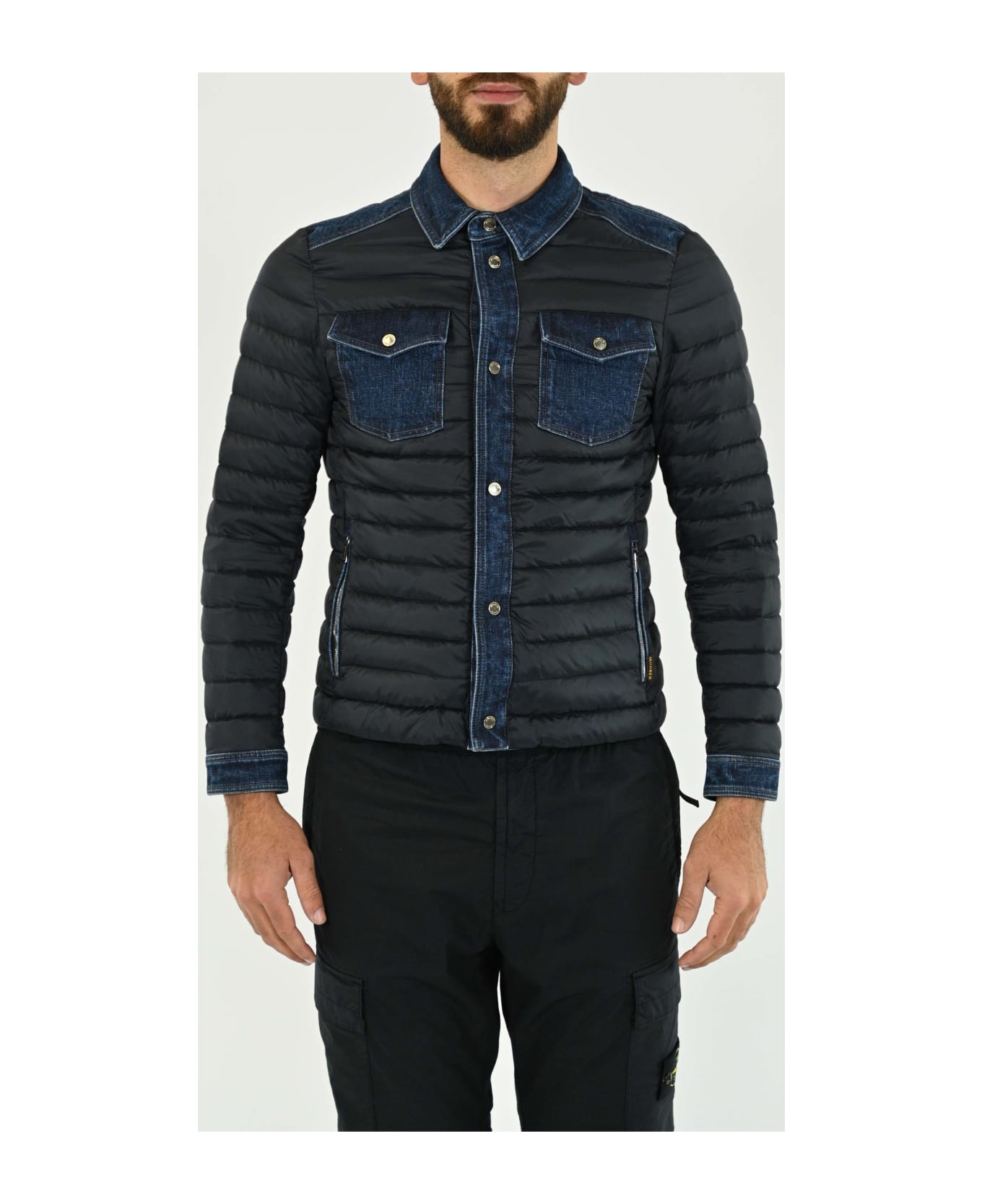 length: 65cm. down quilted shirt in a mix of materials. made in jeans and quilted parts in goose down boudin nylon. finished garment treated with stone wash which makes the garment wavy and the seams worn. the thread is slightly contrasting. front closure with metal snap buttons. side pockets with zip and patch on the chest. internally lined with practical pockets for documents and finishes with logo tapes.