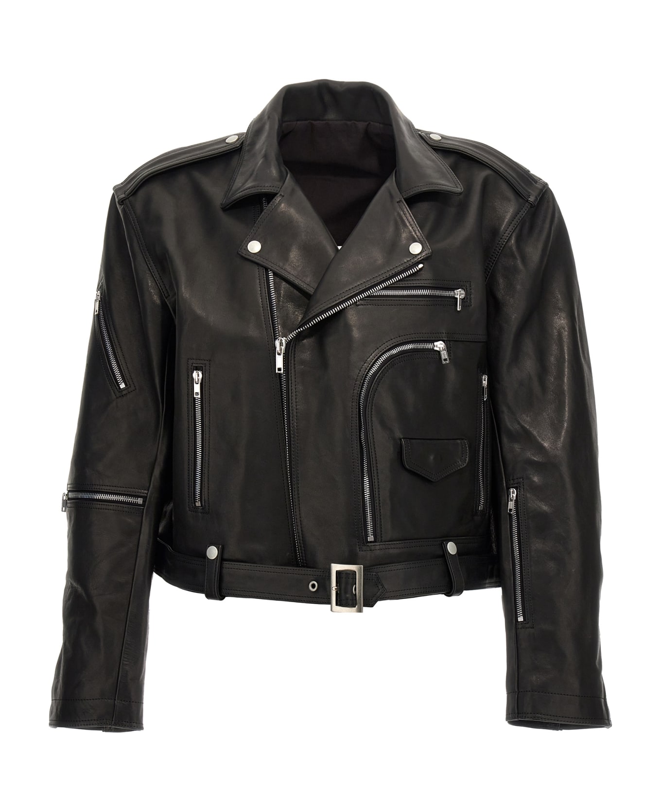 'Cropped Jumbo Bauhaus Stooges' leather jacket with zip closure, pockets, belt at the waist, long sleeves.