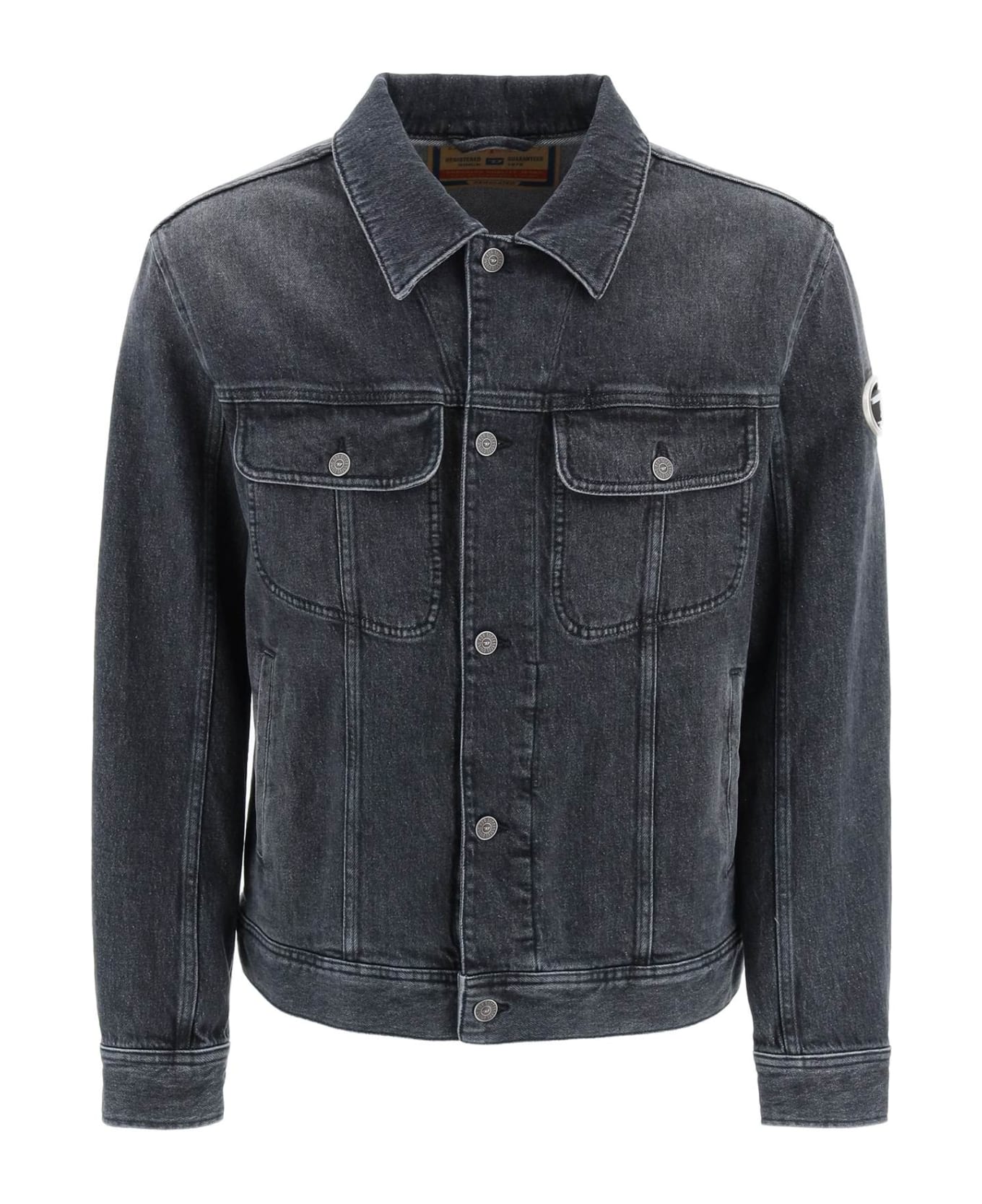 Diesel jacket made of cotton stretch washed denim featuring pointed collar, button placket, patch and welt front pockets, adjustable button-tab hem. Finished with branded metal hardware and cut-out D-Oval logo on the left sleeve. Regular fit. The model is 187 cm tall and wears a size L.