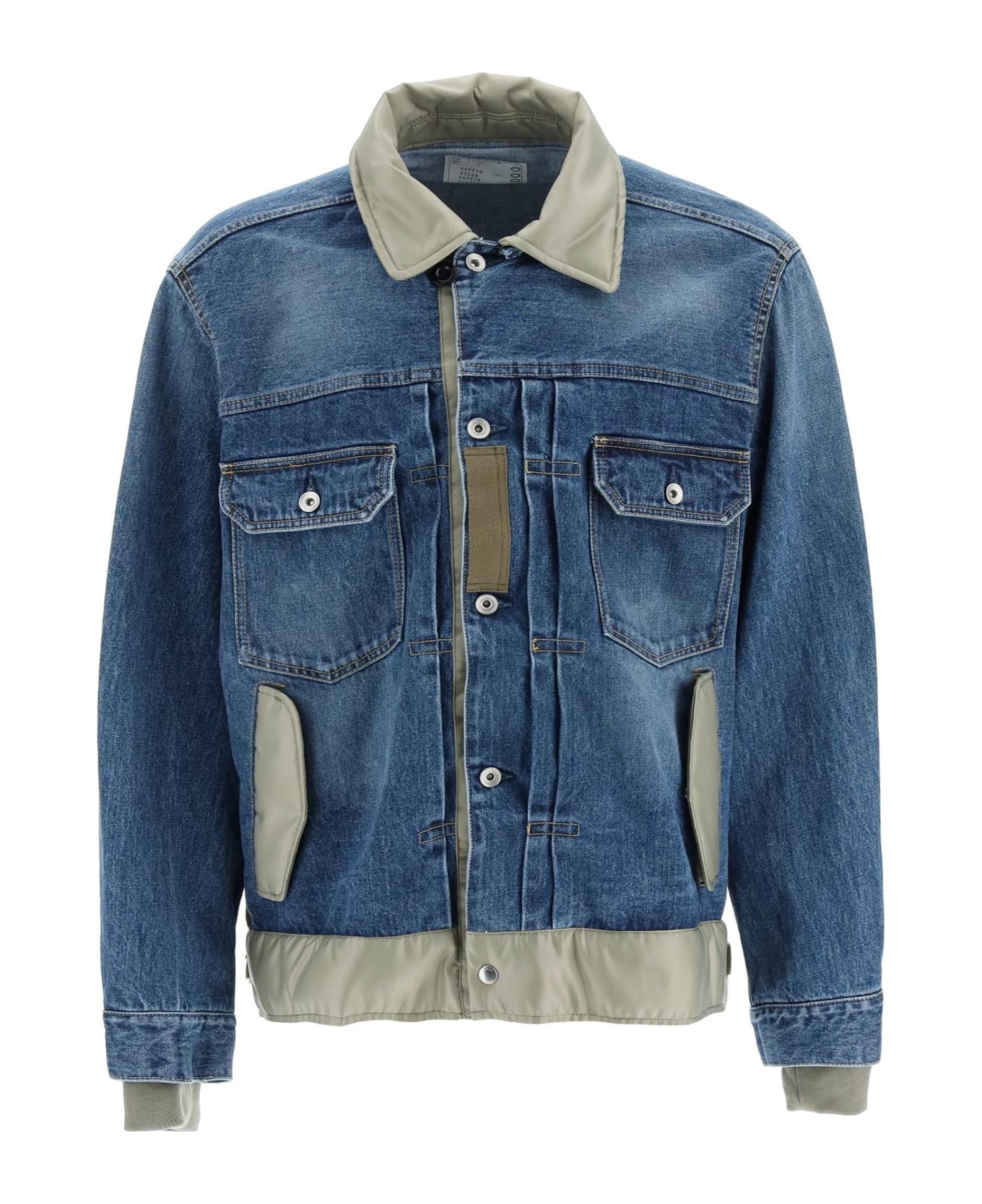 Cotton denim Jacket crafted with a hybrid construction enhanced by nylon inserts. It features a double concealed zip closure with branded metal buttons, side slanted pockets with flap, button-through flap patch pockets on the chest and classic collar. Single-button cuffs finished with ribbed-knit inserts and side openings enclosed with concealed press buttons and grosgrain buckle tabs. Relaxed fit. The model is 187 cm tall and wears a size 3.