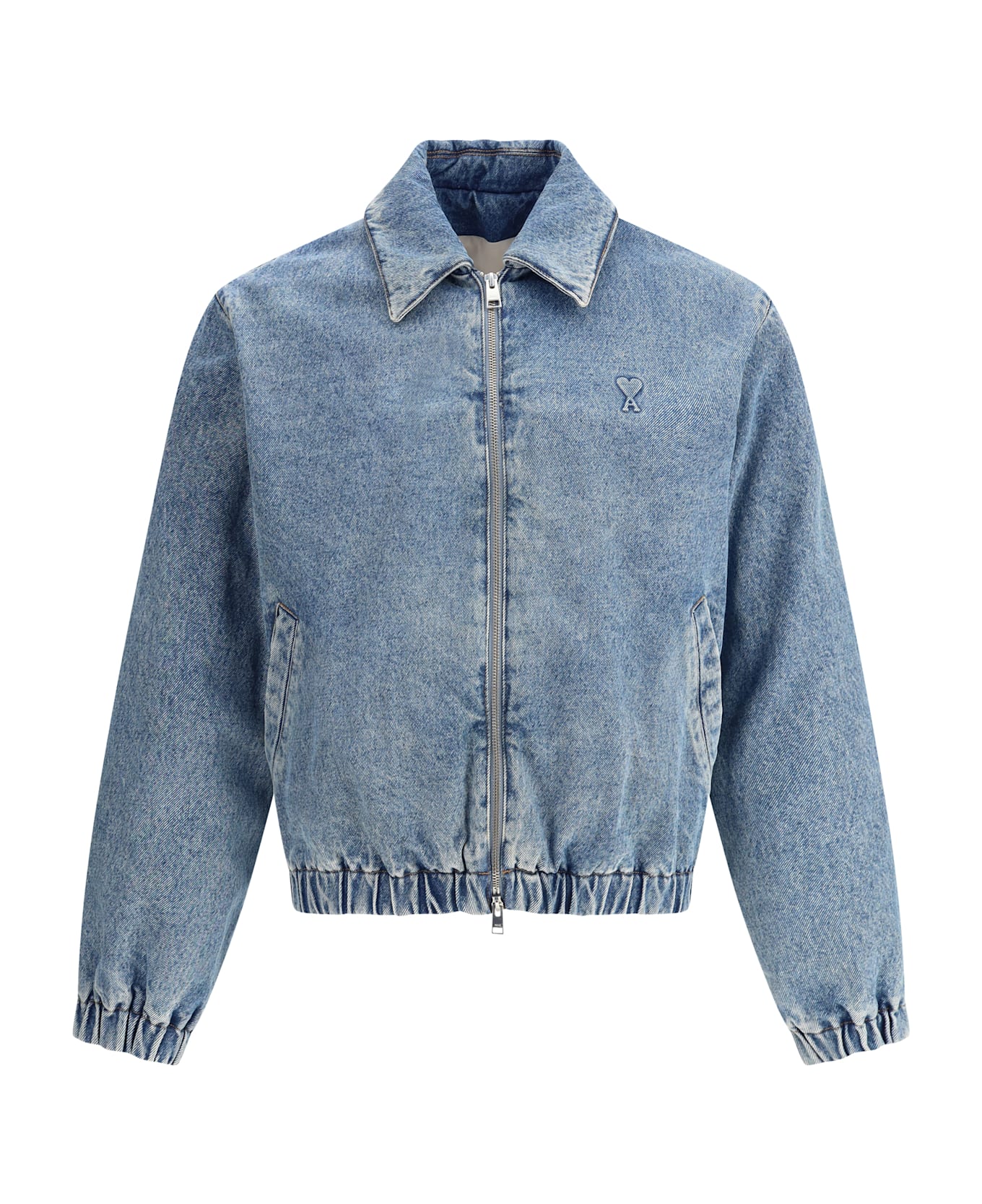 The cotton jacket by ami paris is a stylish and versatile piece with a denim design that combines casual style with a refined touch. the classic collar lends an understated and sophisticated look, while the double-slider front zipper closure adds functionality and a modern touch. the two side welt pockets offer practicality, while the iconic embossed logo on the front represents the brand in an understated yet distinctive way. elasticized cuffs and an elasticized hem ensure a comfortable, snug fit, completing the functional, contemporary design.