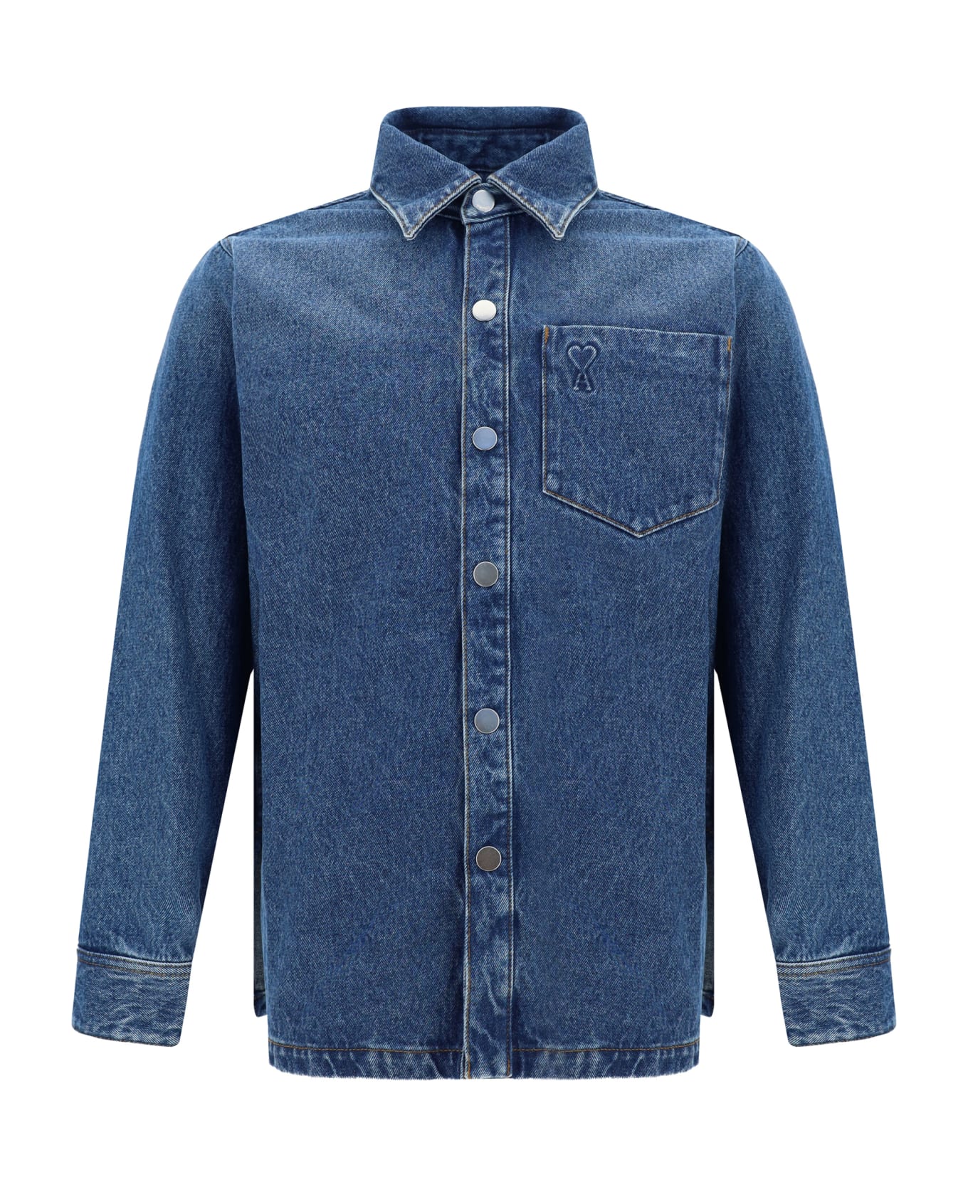 Cotton denim shirt by ami paris, classic collar, snap button front closure, front patch welt pocket with embossed iconic brand logo detail, side slits, adjustable button cuffs, monochrome pattern, regular fit. Composition: 100% % Cotton