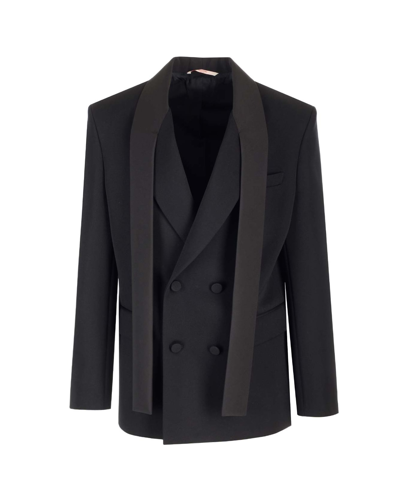 Black double-breasted jacket from Valentino Garavani in wool, silk faille scarf collar, cupro lining, over fit, peak lapels, wool-covered button closure, two front pockets with flap, one welt pocket on the chest. Composition: 100% VIRGIN WOOL