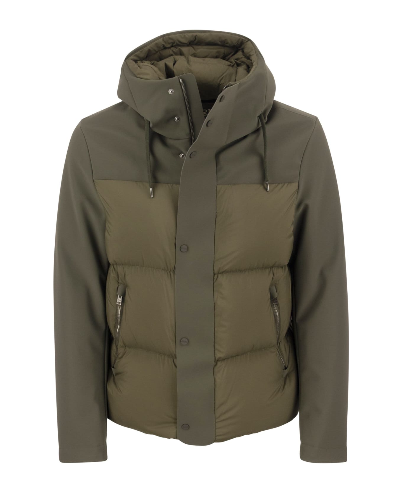 Bomber jacket made of recycled nylon 6. 6 microfibre fabric, finished with WR treatment. Garment that clings to the figure like a second skin, being extremely practical thanks to its resistance to pilling and wear. Ideal for carefree winter holidays. Part of the new Herno Globe Lab label, which distinguishes all garments made partly from environmentally sustainable materials. - Regular fit - Adjustable fixed hood with drawstring - Two-way zip and snap fastening - Welt pockets with zip - Goose feather padding - Developed by Herno Globe Lab DESIGNER ID: PI000898U 12456 7720