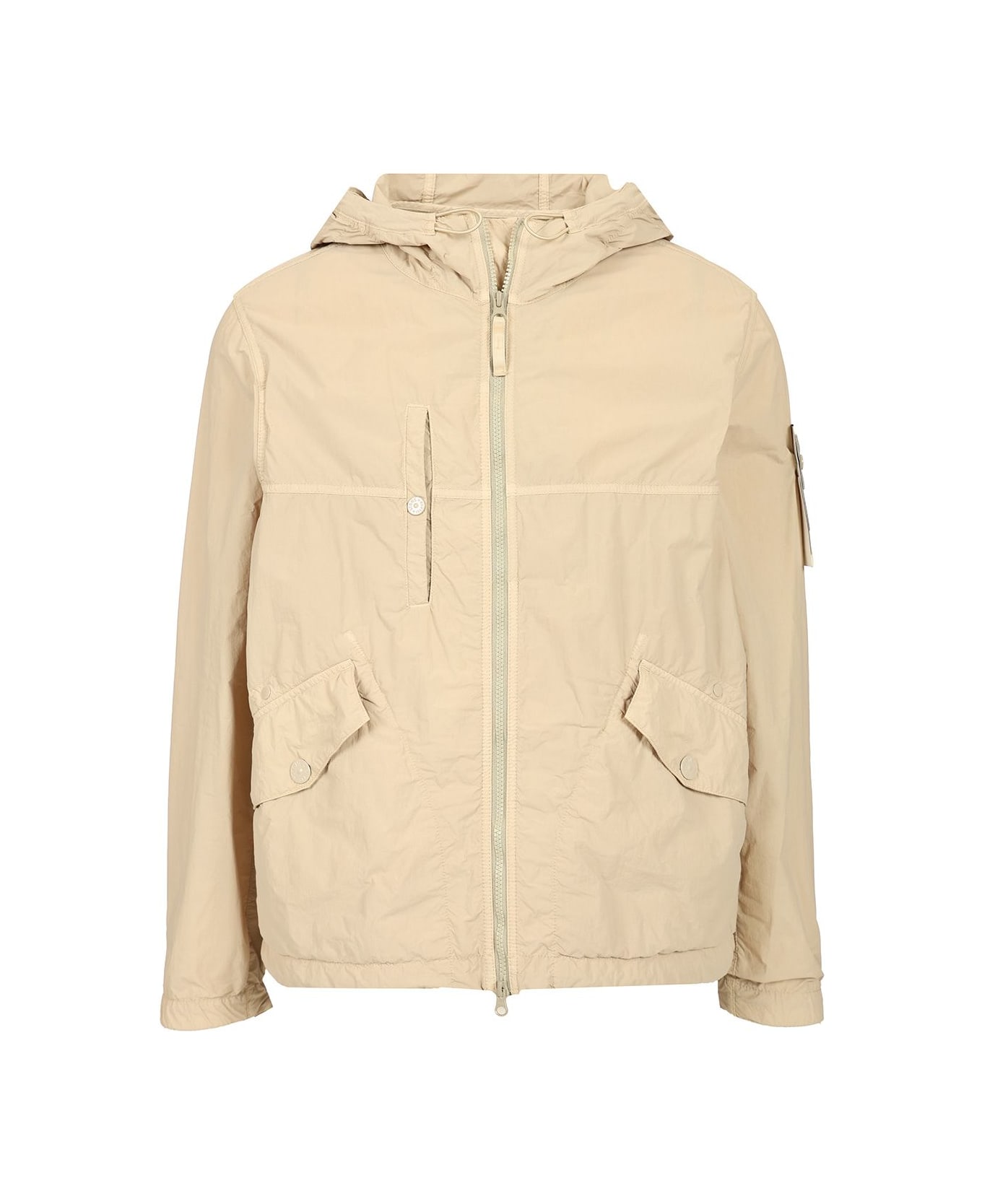 Stone Island "Ghost" jacket made of nylon canvas, featuring a drawstring hood, a chest pocket, slanted pockets with flap and snap closure, two internal pockets, a badge on the left sleeve and a double-slider zip fastening.