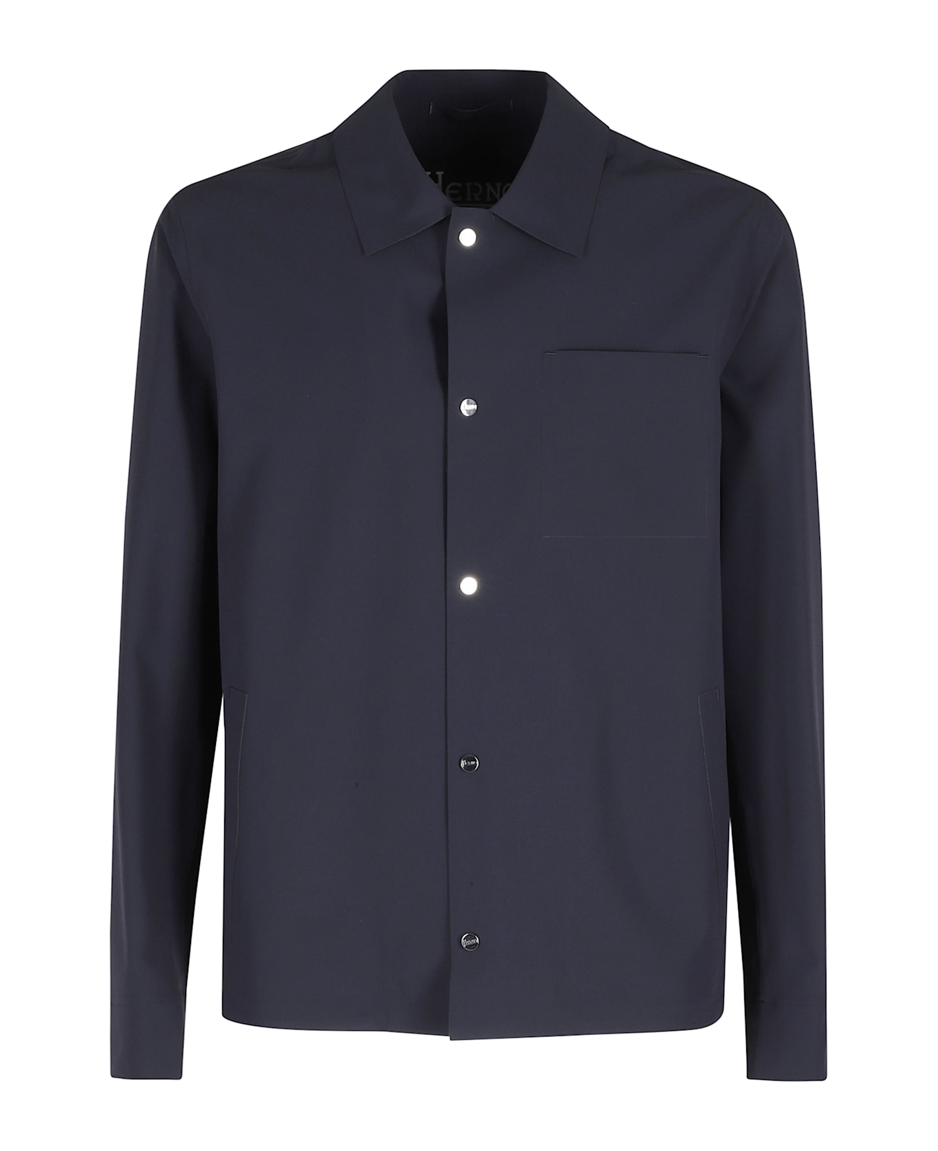Category: Jacket Item: Shirt Jacket Brand: Herno Color: Blue Collar: Shirt collar Pockets: Flush sides and a patch pocket on the chest Details: Logo buttons Closure: With press studs SIZE AND FIT Fit: Regular Sleeve: Long with cuff and button
