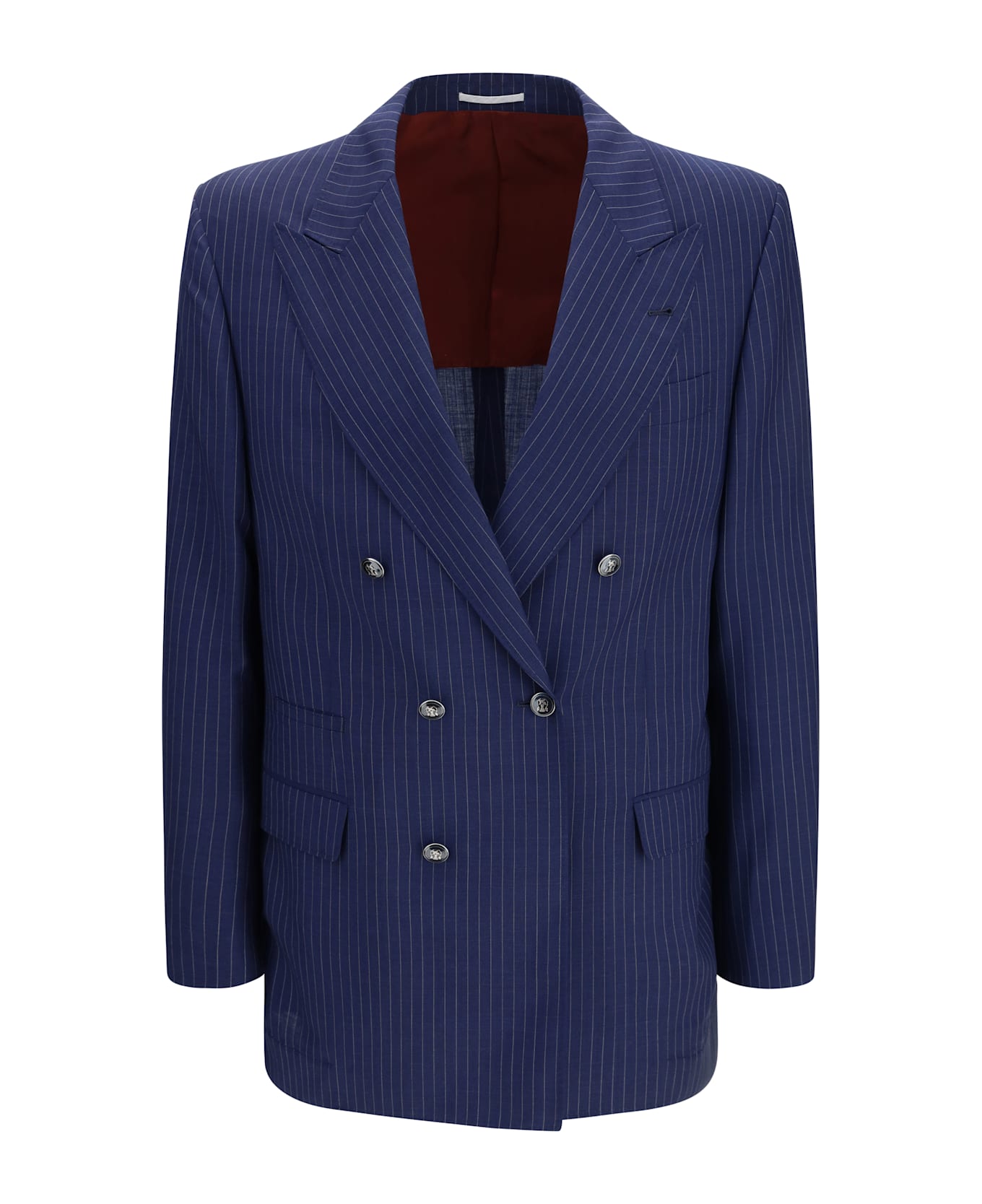The half-breasted pinstriped batavia tailor jacket by brunello cucinelli reflects the refined elegance of italian tailoring through a sophisticated construction and carefully crafted details. the design features a front closure with six metal buttons and peak lapels, enhancing the structured silhouette of the piece. the cuffs are finished with four metal buttons and working buttonholes, a classic tailoring element, while the front includes flap welt pockets, a ticket pocket and a chest pocket. inside, the jacket is completed with two buttoned internal pockets and a pen pocket, while the double back vent ensures comfort and freedom of movement while maintaining an elegant fit.