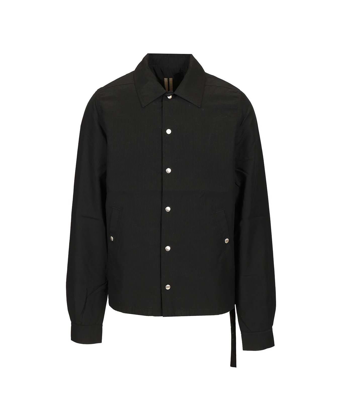 Hollywood snap button jacket from Drkshdw in black TENCEL RIPSTOP, featuring a classic collar, long sleeves with snap button cuffs, side welt pockets with snap buttons and a drawstring hem, inner pockets with snap buttons.