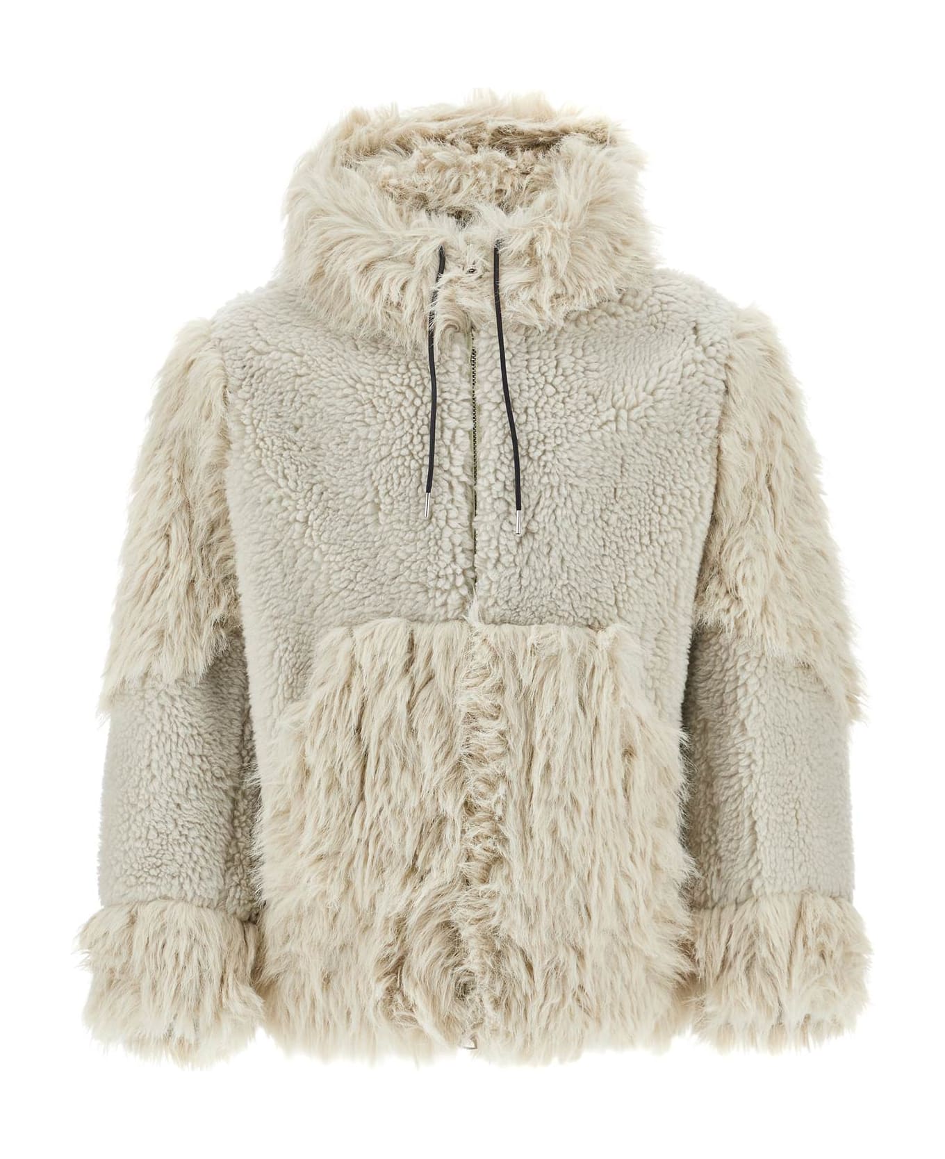 Crafted in wool shearling and faux fur, this Sacai jacket stands out for its hoodie-inspired design, featuring a drawstring hood, two-way zip closure, and divided kangaroo pocket. The loose fit is lined on the inside. The model is 182 cm tall and wears size 2.