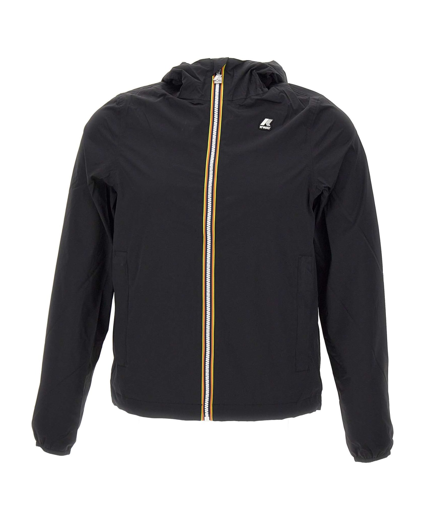 K-Way men's jacket 'Jack Stretch Jersey', black, in waterproof and windproof stretch, lining in soft grey jersey, heat-taped seams, adjustable hood, slim fit, zip fastening, edges with elastic, two pockets with zip, logo patch on chest, ideal in high and low season.