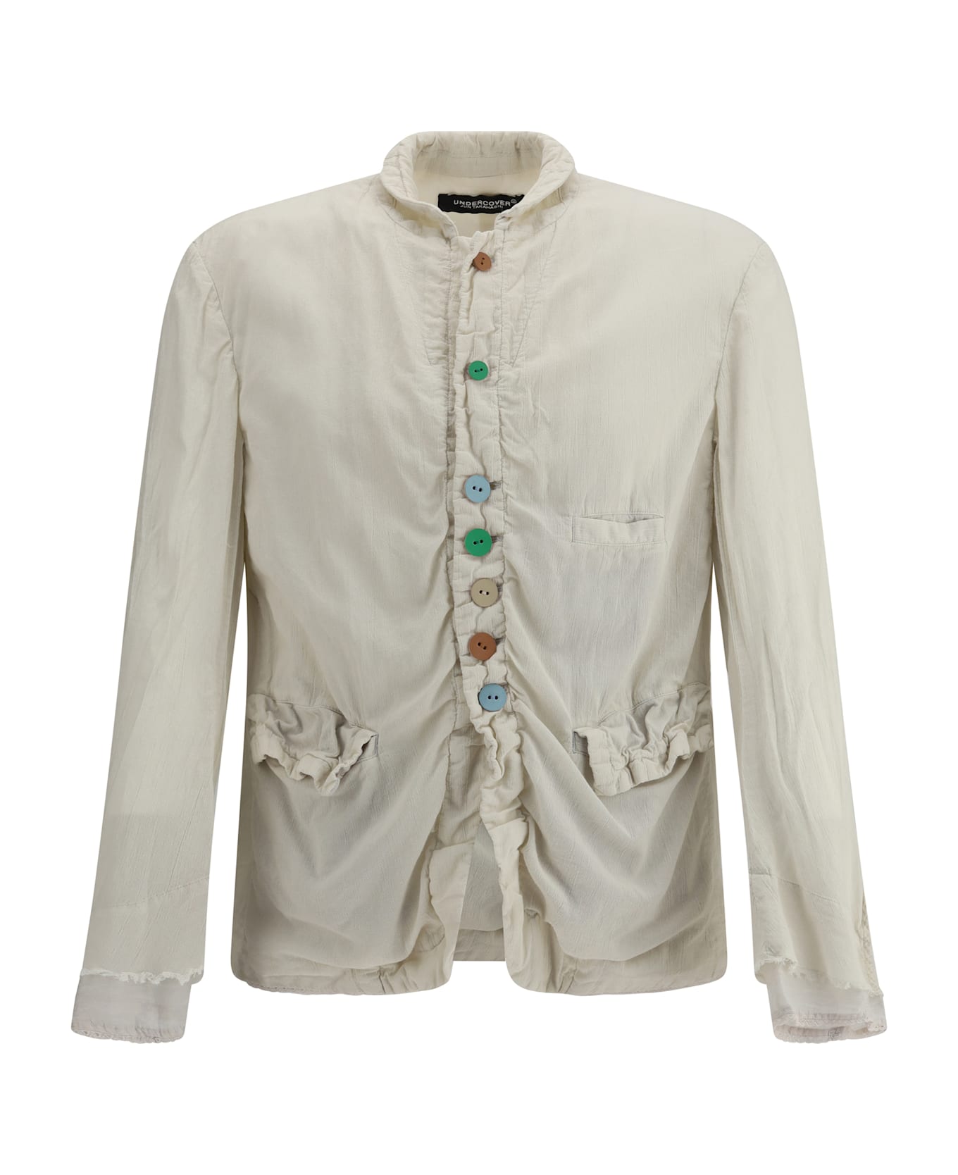 Undercover's jacket combines unexpected details with a refined design. featuring a multicolored front button closure, it has three welt pockets on the front, two of which have flaps, adding functionality and style. the lace-trimmed hems lend a romantic and original touch for a sophisticated look with contemporary character.