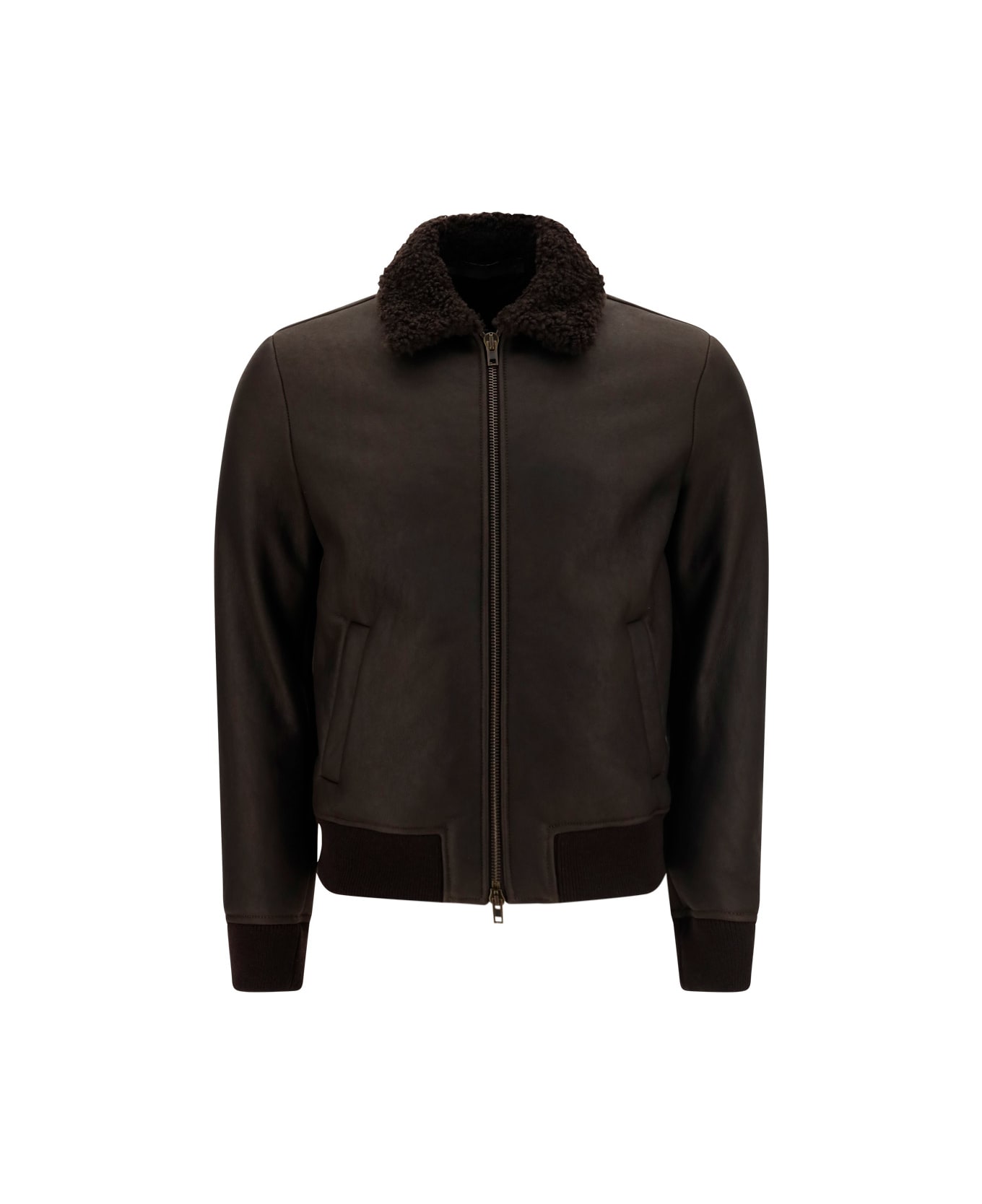 Calfskin jacket by salvatore santoro, shiny leather design, classic shearling collar, double-slider front zipper closure, two side welt pockets, ribbed hem, ribbed cuffs, regular fit.