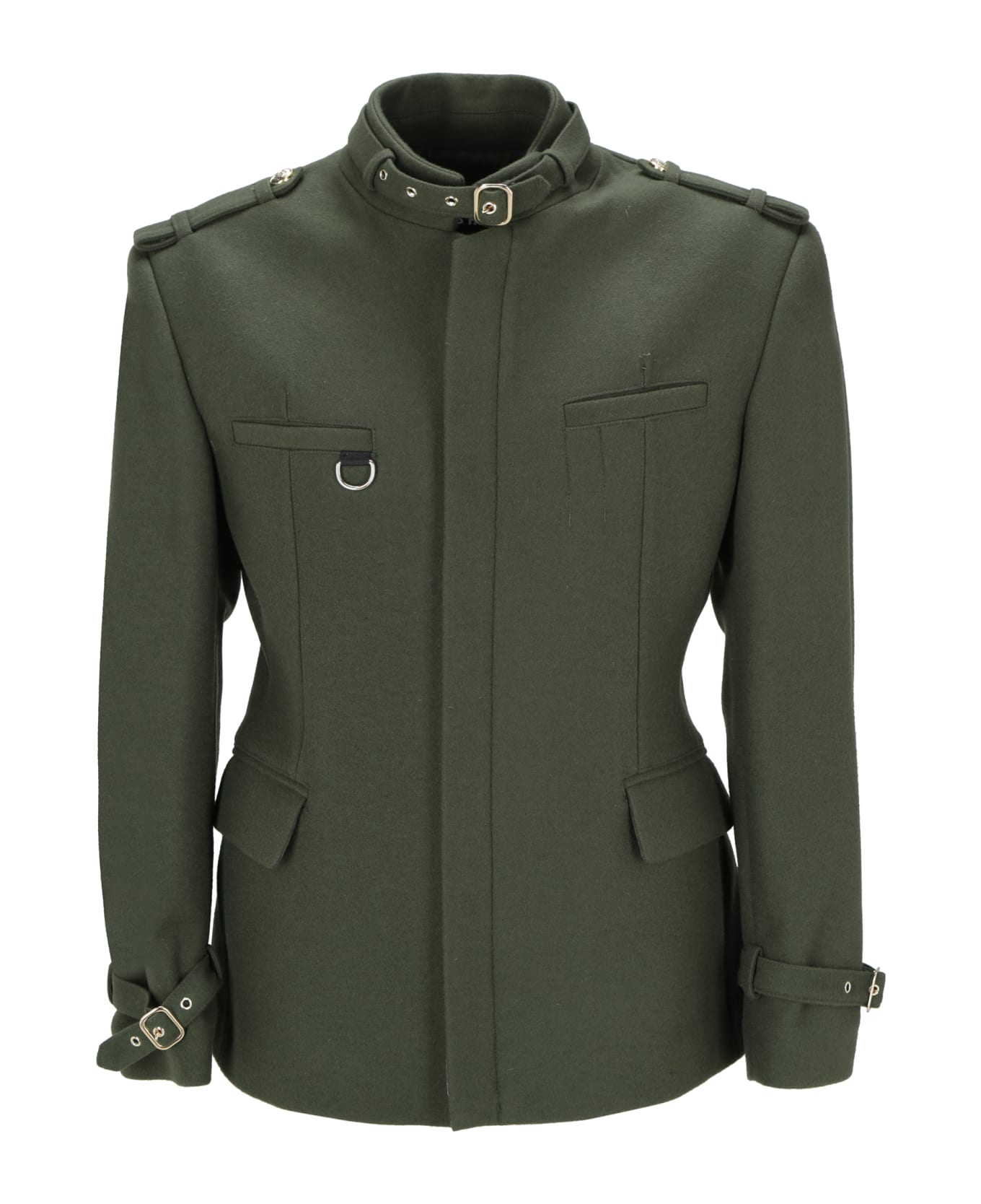 Wool jacket by les hommes, front zip closure, mandarin collar adjustable by buckle and strap, two welt pockets with side flap, two slit pockets at the front, slit at the back, structured shoulders, regular fit.