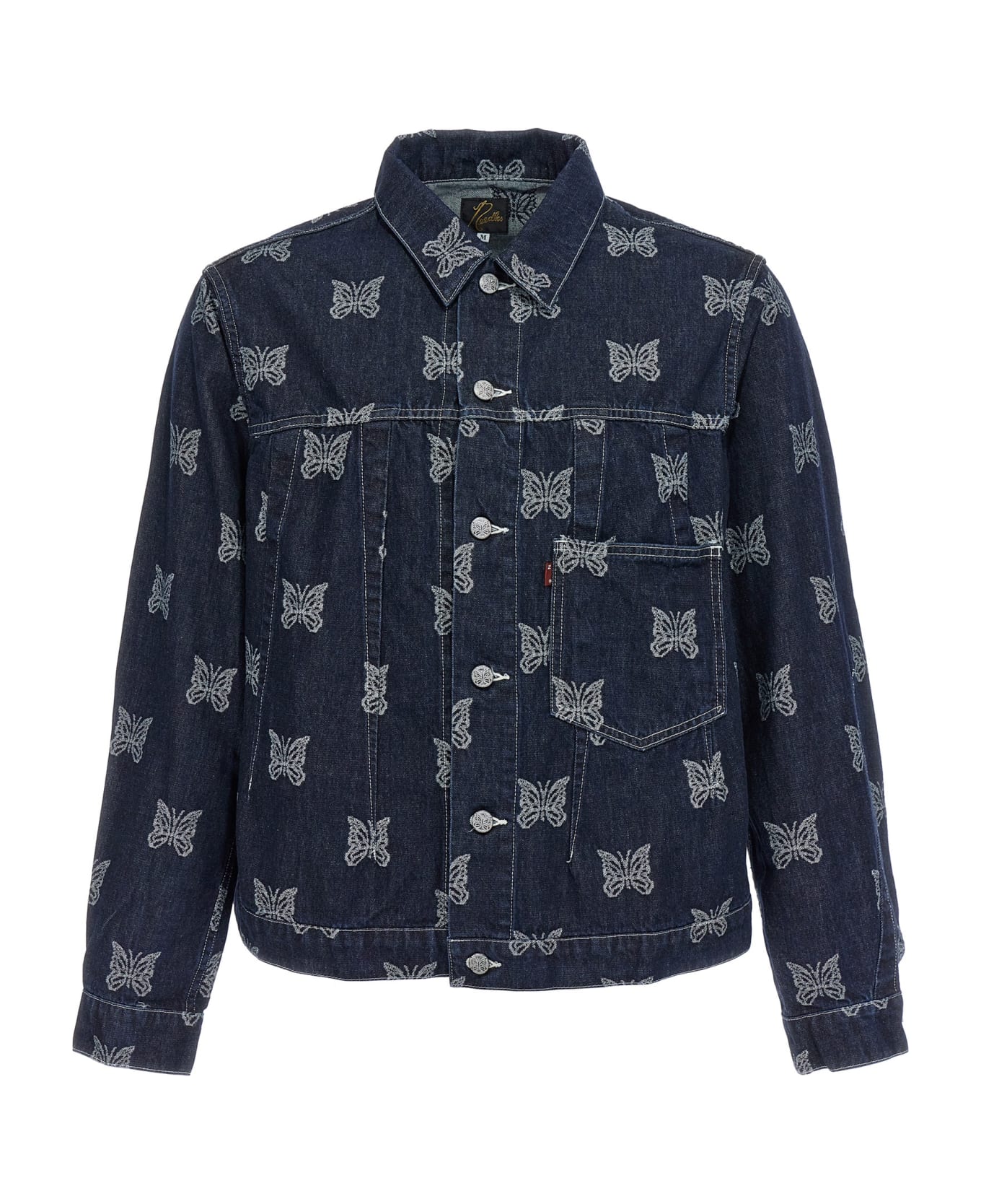Cotton denim jacket withll over jacquard pattern, front pocket, a button closure, and long cuffed sleeves.