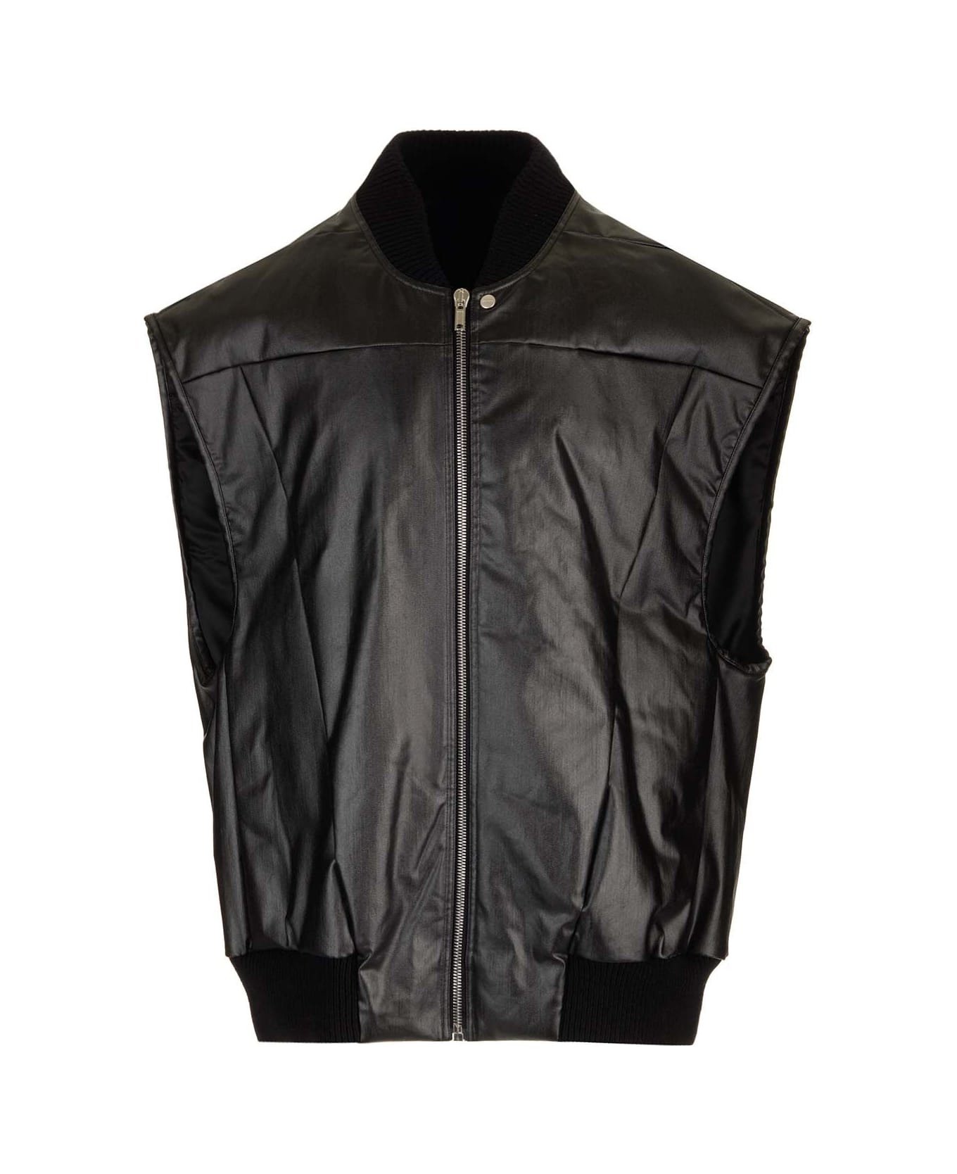 Black 'Jumbo Filight' vest from Rick Owens in coated stretch denim, hip length, sleeveless, front zip and top button closure, side pockets with buttons, ribbed knit collar and bottom, two internal zip pockets, features a strap in cotton with rivets, diagonal stitching lines running front and back, lightly padded and fully lined, oversized fit.