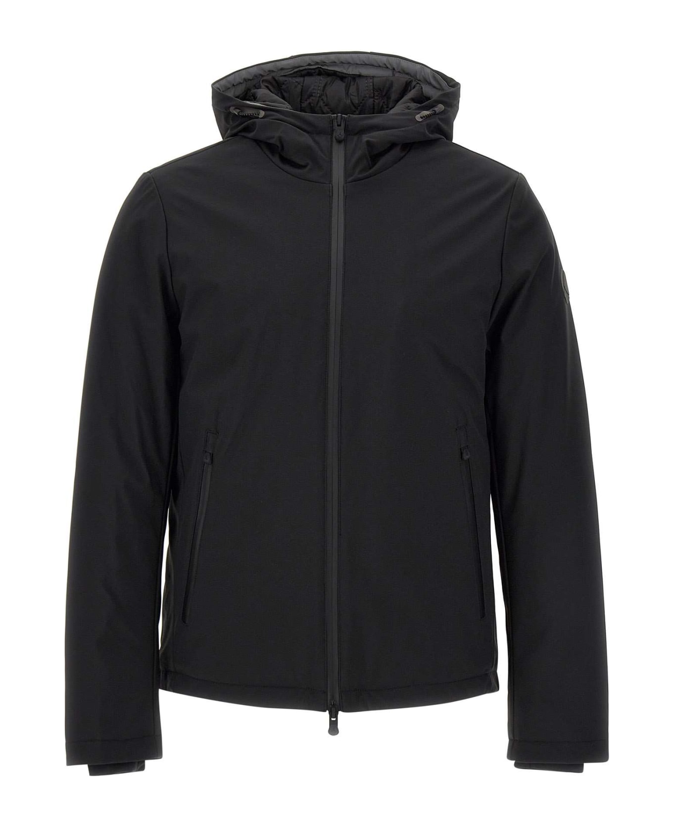 People of Shibuya "Kita" men's jacket, black, water-repellent and breathable technical fabric Ellex with diamond quilted interior with thermal insulation, hood with adjustable drawstring, front closure with windproof zip with easy-close double-slider customized rubber pad, inner cuffs in technical lycra, left sleeve rubberized logo, internal heat-taped document holder pocket, high visibility reflective details, regular fit.