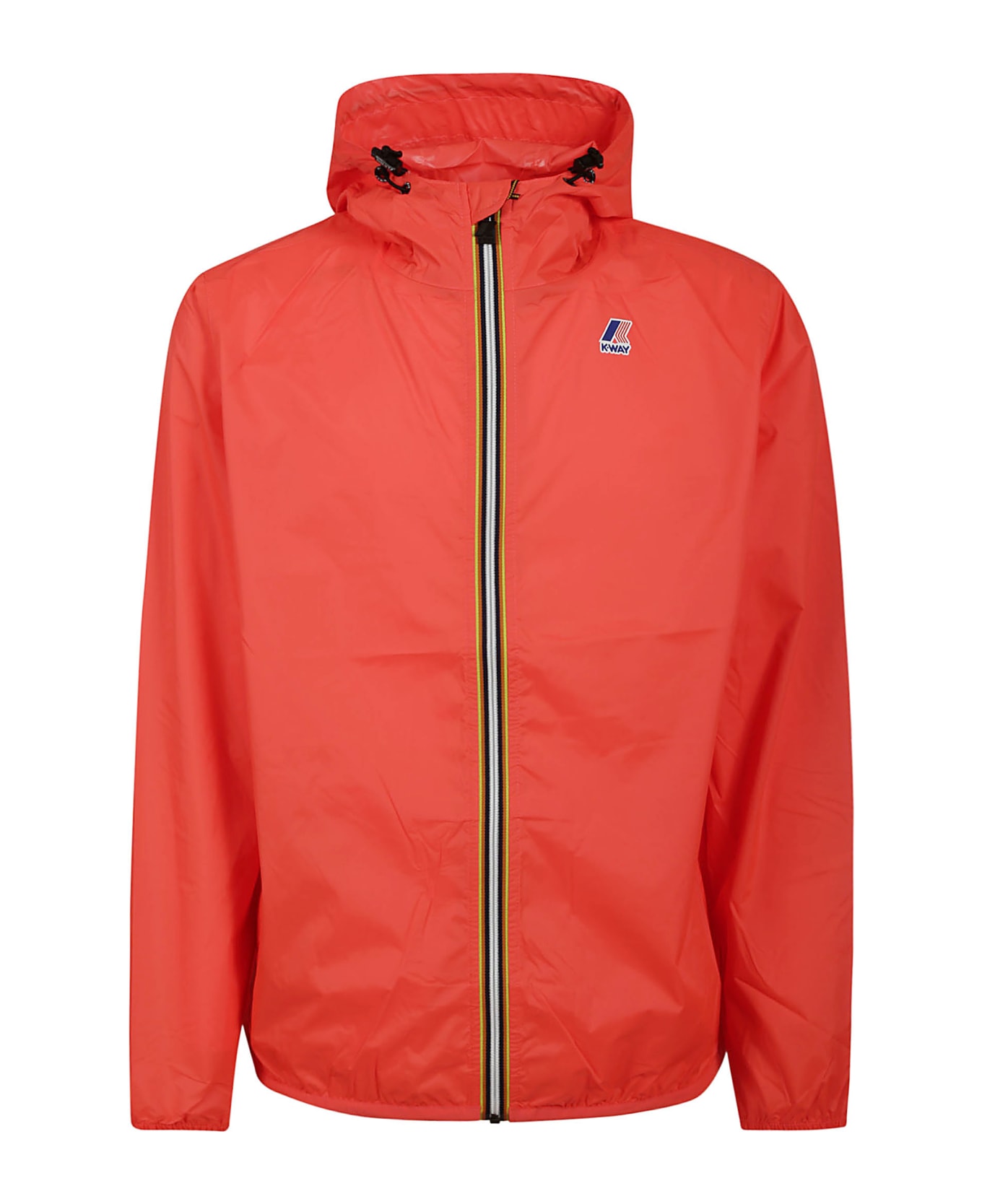 K-way Red nylon jacket, hood with drawstring, waterproof, water-repellent, windproof, breathable ripstop fabric, heat-taped seams, adjustable hood with elastic cord, zip closure, internal windproof flap, elastic cuffs, 2 zip pockets, logo detail colorful printed.