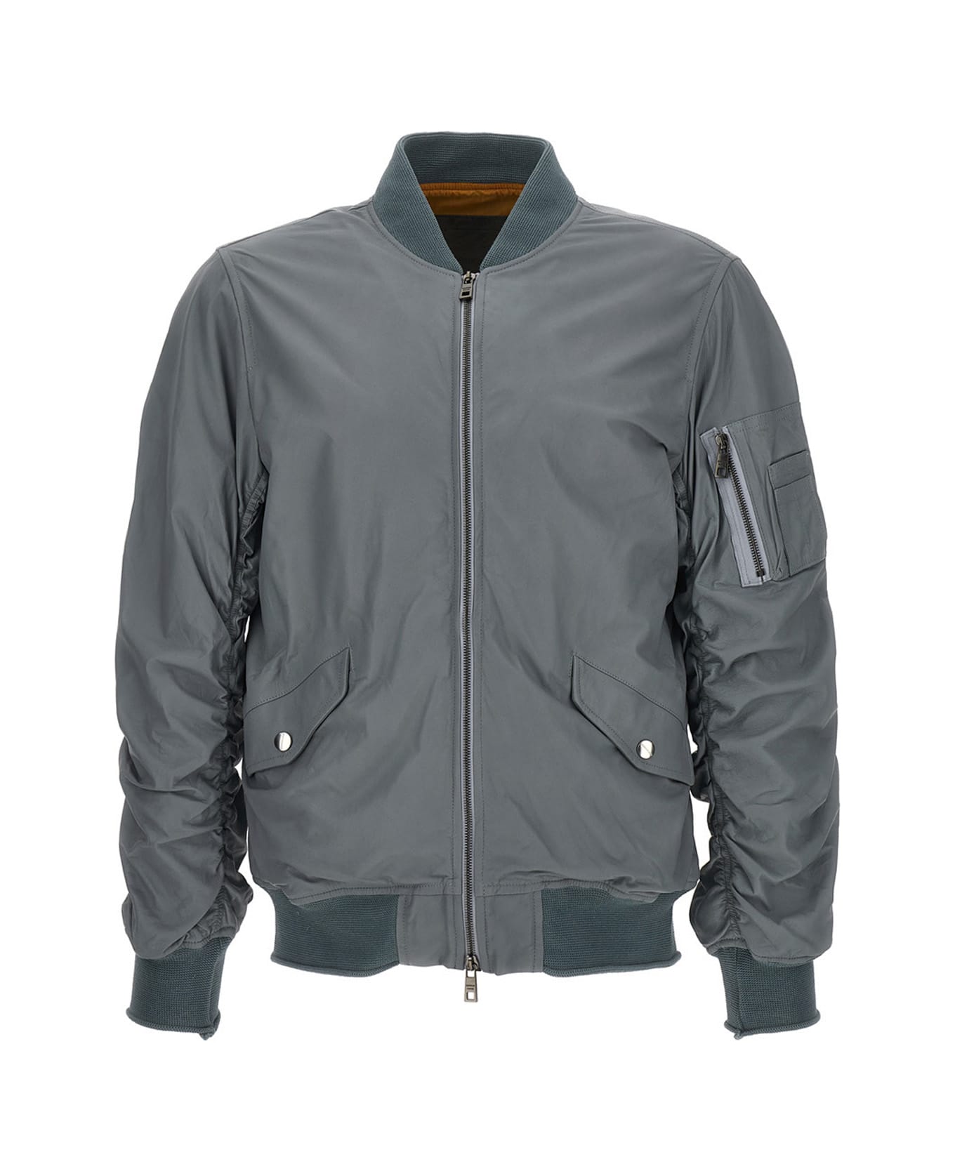 Leather bomber jacket with zip closure, pockets, and long knitted cuffed sleeves.
