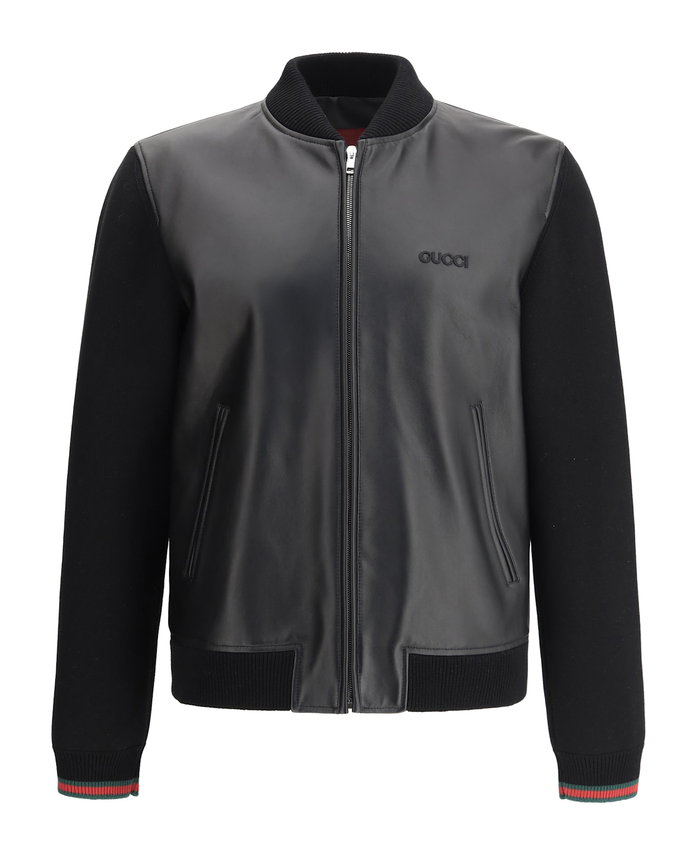 Gucci's leather bomber jacket features a front zipper closure, while the collar and hem are ribbed knit for a soft, comfortable feel. knit sleeves add a dynamic contrast to the leather, creating a sleek and modern mix of materials. ribbed cuffs are embellished with colorful bands, the brand's iconic symbol, echoing gucci's distinctive style. the brand's iconic monogram is stitched tone-on-tone on the front, adding a subtle but recognizable detail. a garment that combines sophistication and sportiness in a sophisticated way.