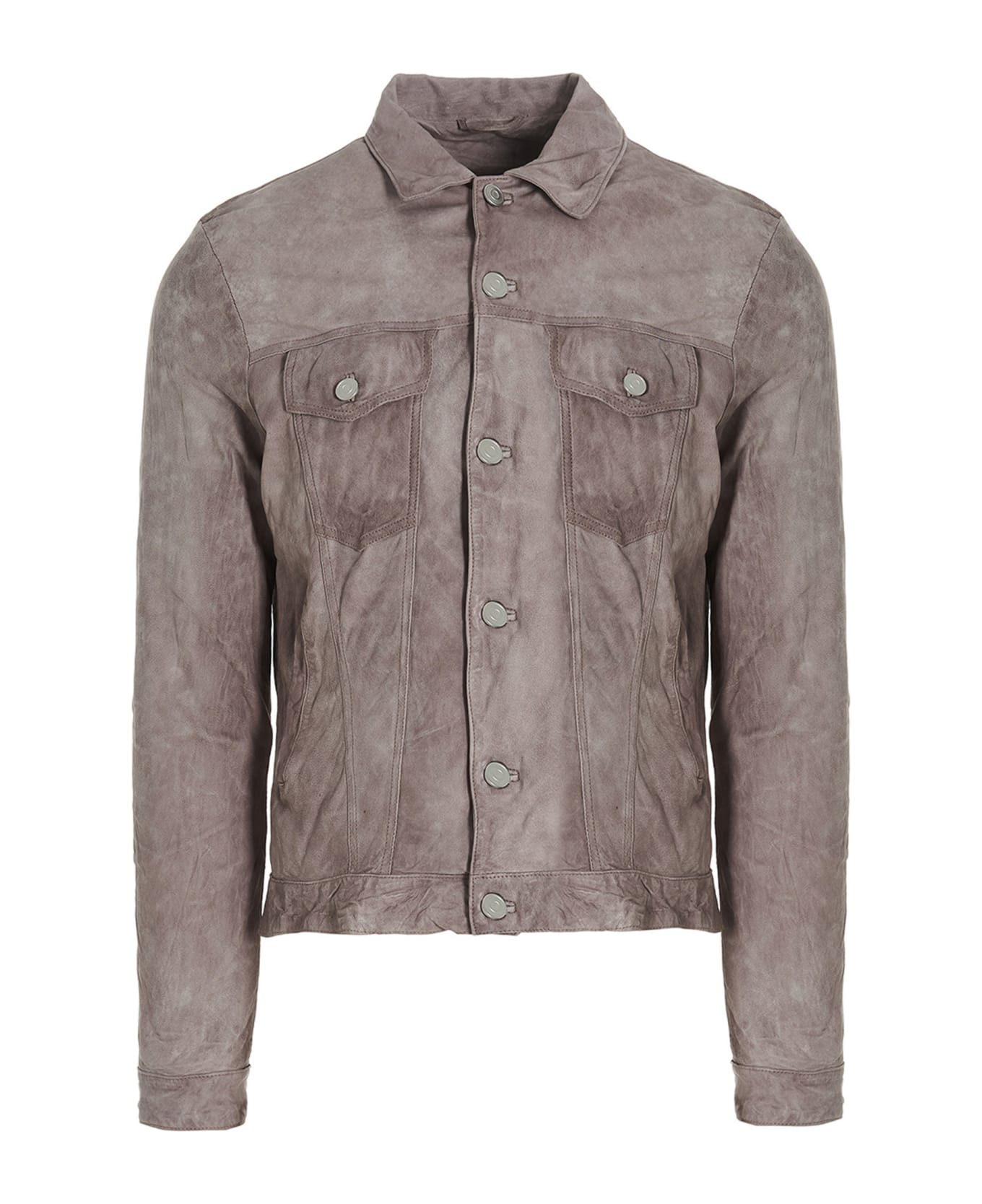 Leather jacket with a button closure, pockets and long cuffed sleeves.