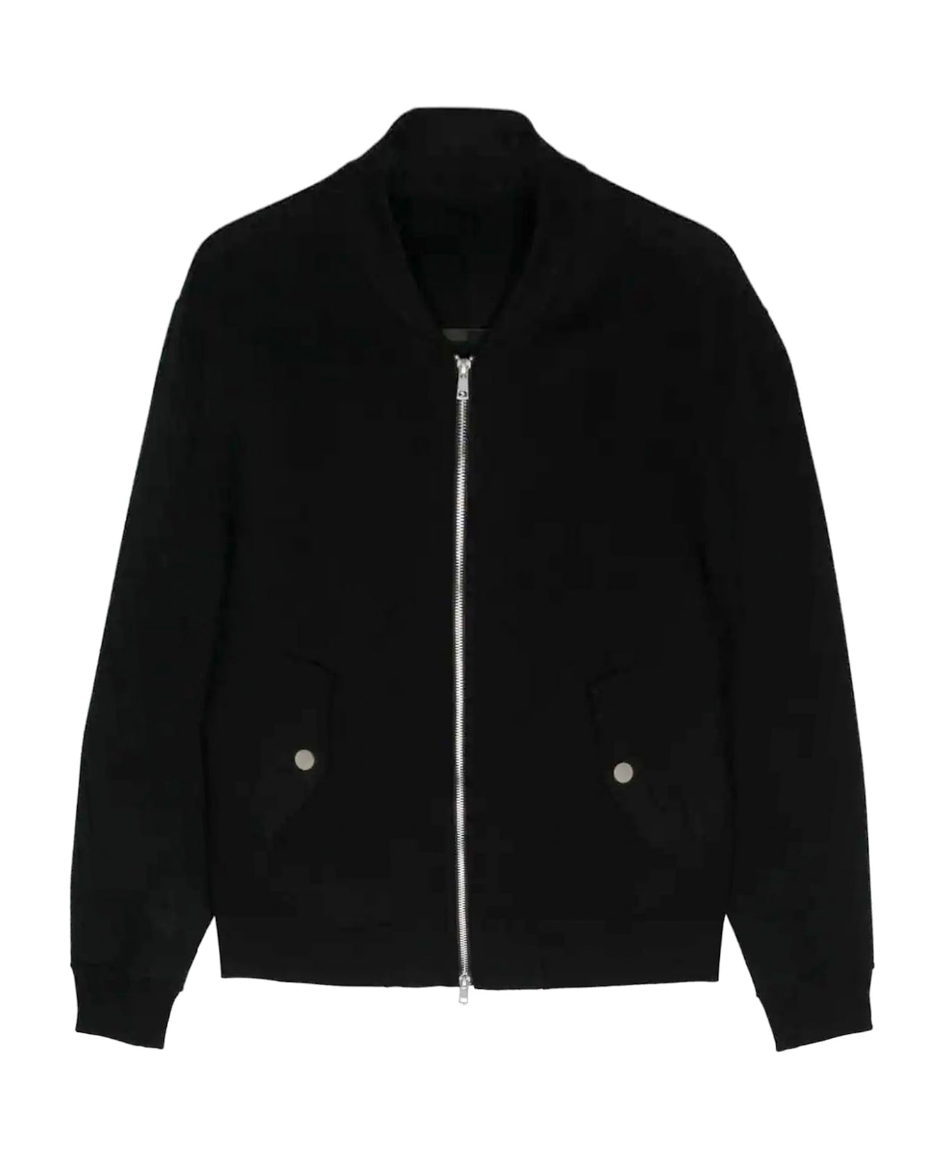 Black wool bomber jacket, felted finish, front two-way zip fastening, ribbed trim, baseball collar, long sleeves, two side flap pockets, straight hem Composition: Wool, 100%