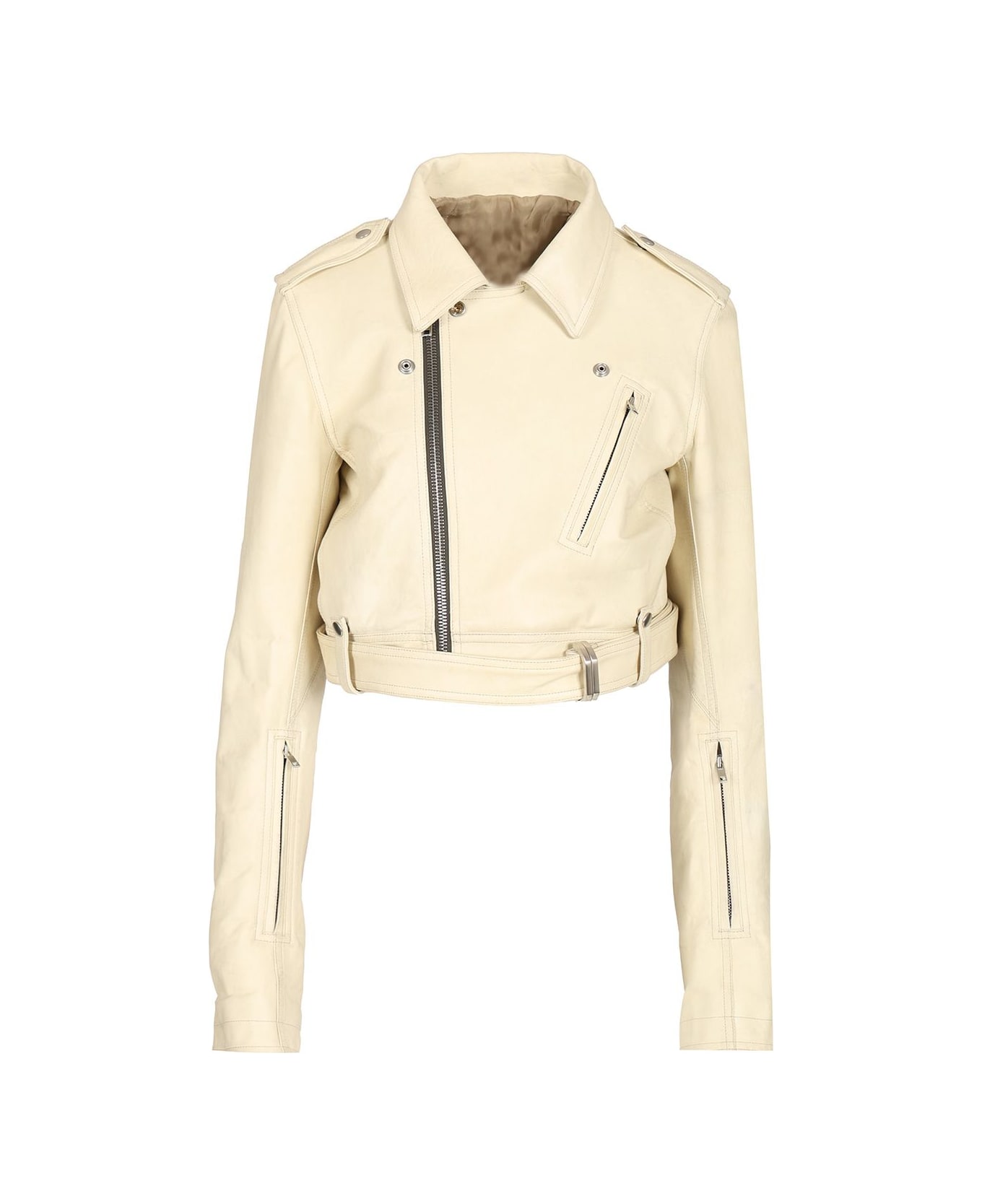 Luke s Stoeger leather biker jacket in light beige off-center front zip fastening belted design chest zip pocket crop design