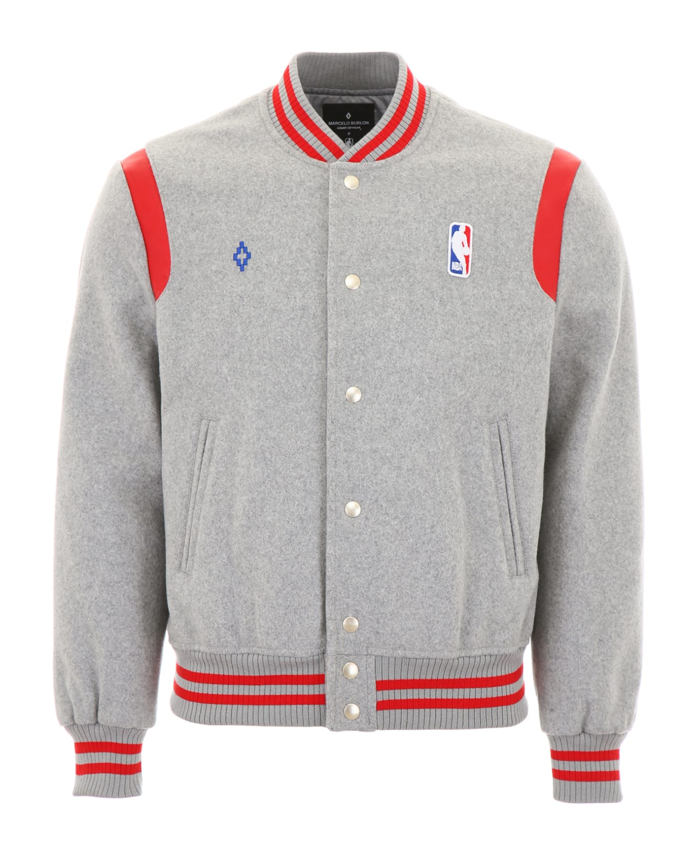 Marcelo Burlon wool bomber jacket with NBA patch and embroidered logo on the front and back. It features contrast leather inserts on the shoulders, snap button closure, side welt pockets, ribbed hems with contrast stripes. Model height is 184 cm and he is wearing a size M.