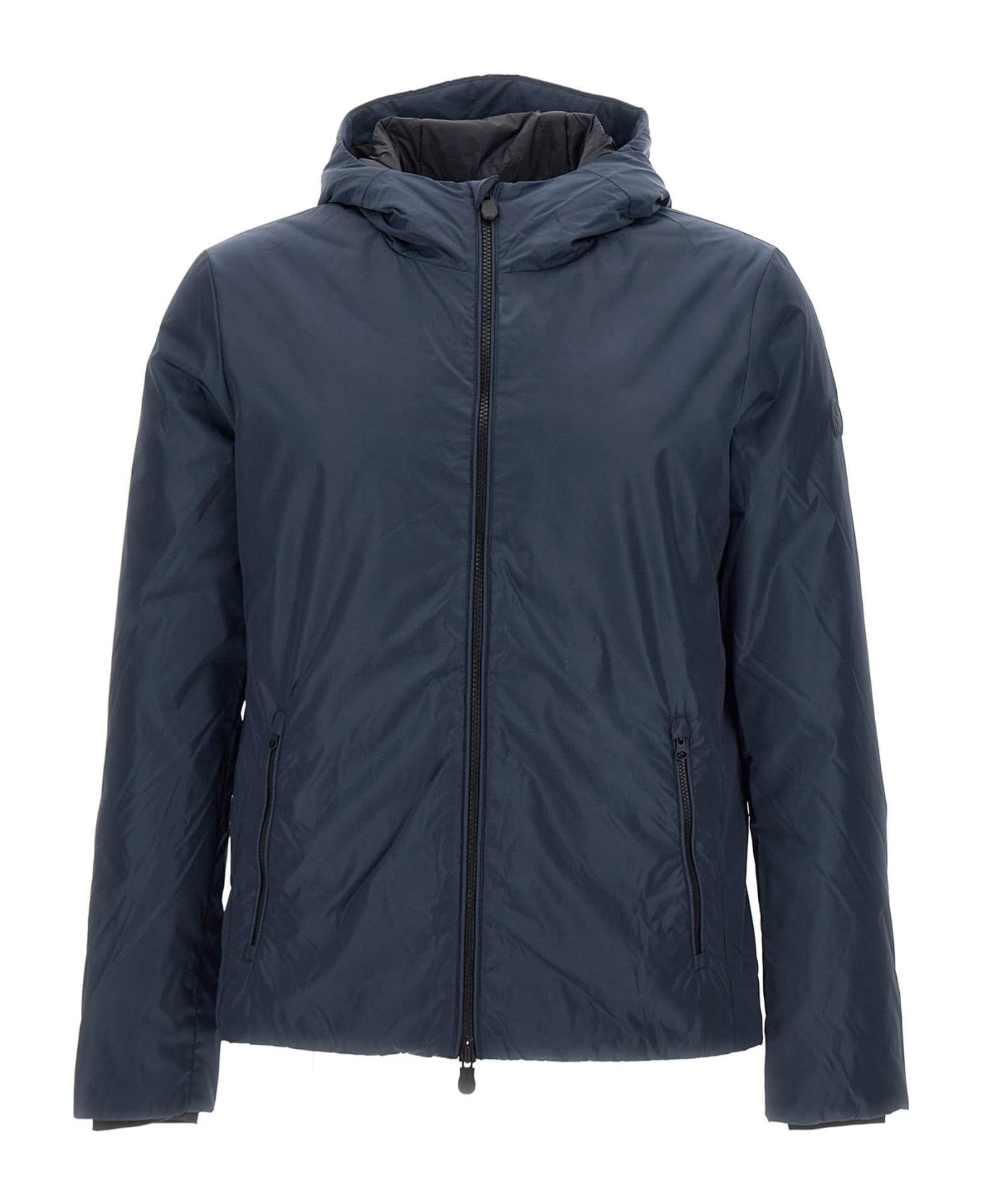 Save The Duck "Mega16Perseus" men's jacket, navy blue, in water resistant and windproof nylon, Eco-friendly with Plumtech padding, front fastening with two-way zip, two side pockets with zip, With padded hood, drawstring at hem to adjust fit, lycra cuffs, regular fit, machine washable up to 30°C, perfect for high and low season. Storage bag included.