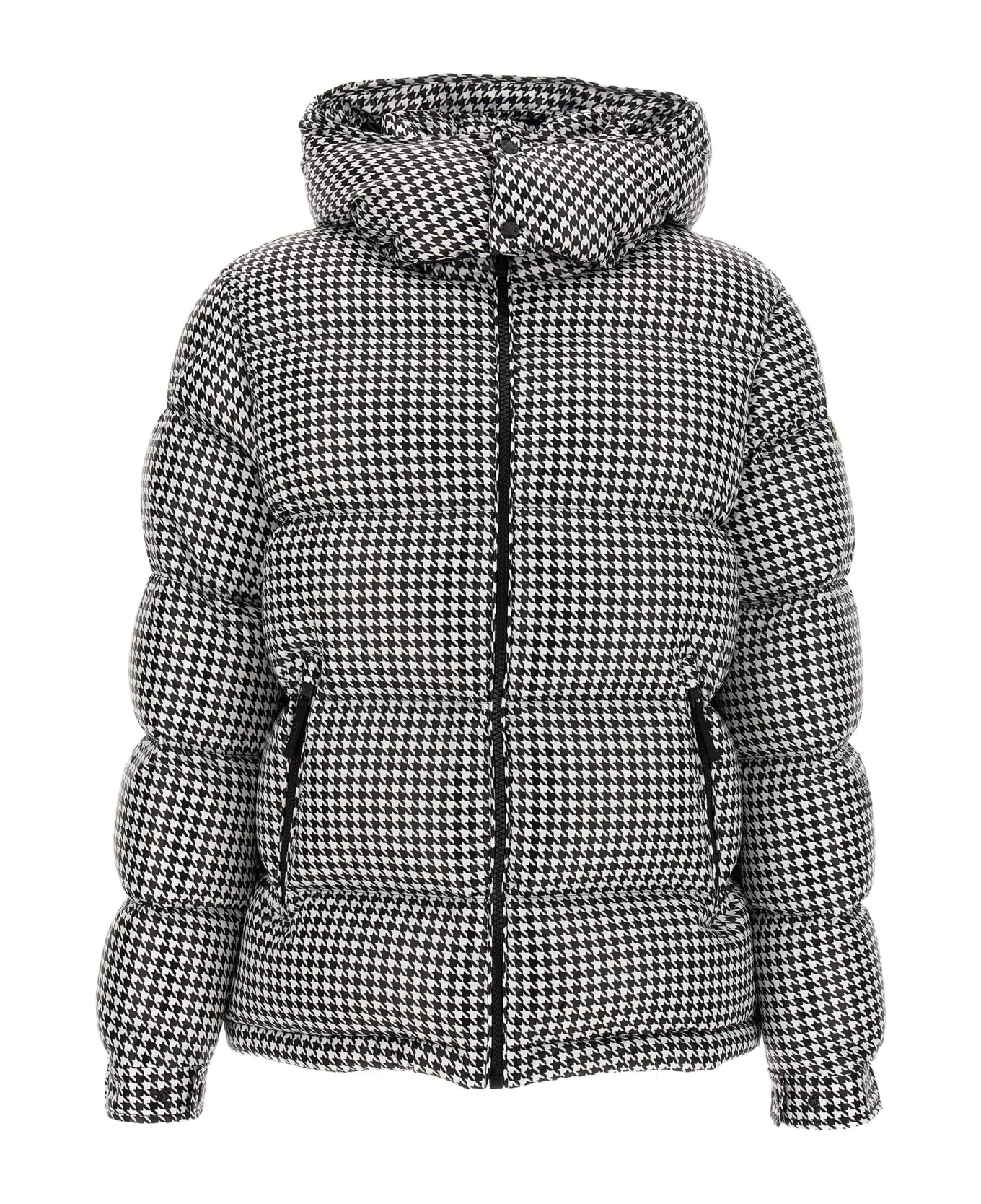 Moncler Genius x Fragment 'Socotrine' goose down jacket with hoarding print, featuring a removable hood, pockets, long sleeves with adjustable cuffs, djustable drawstring hem and a zip closure.