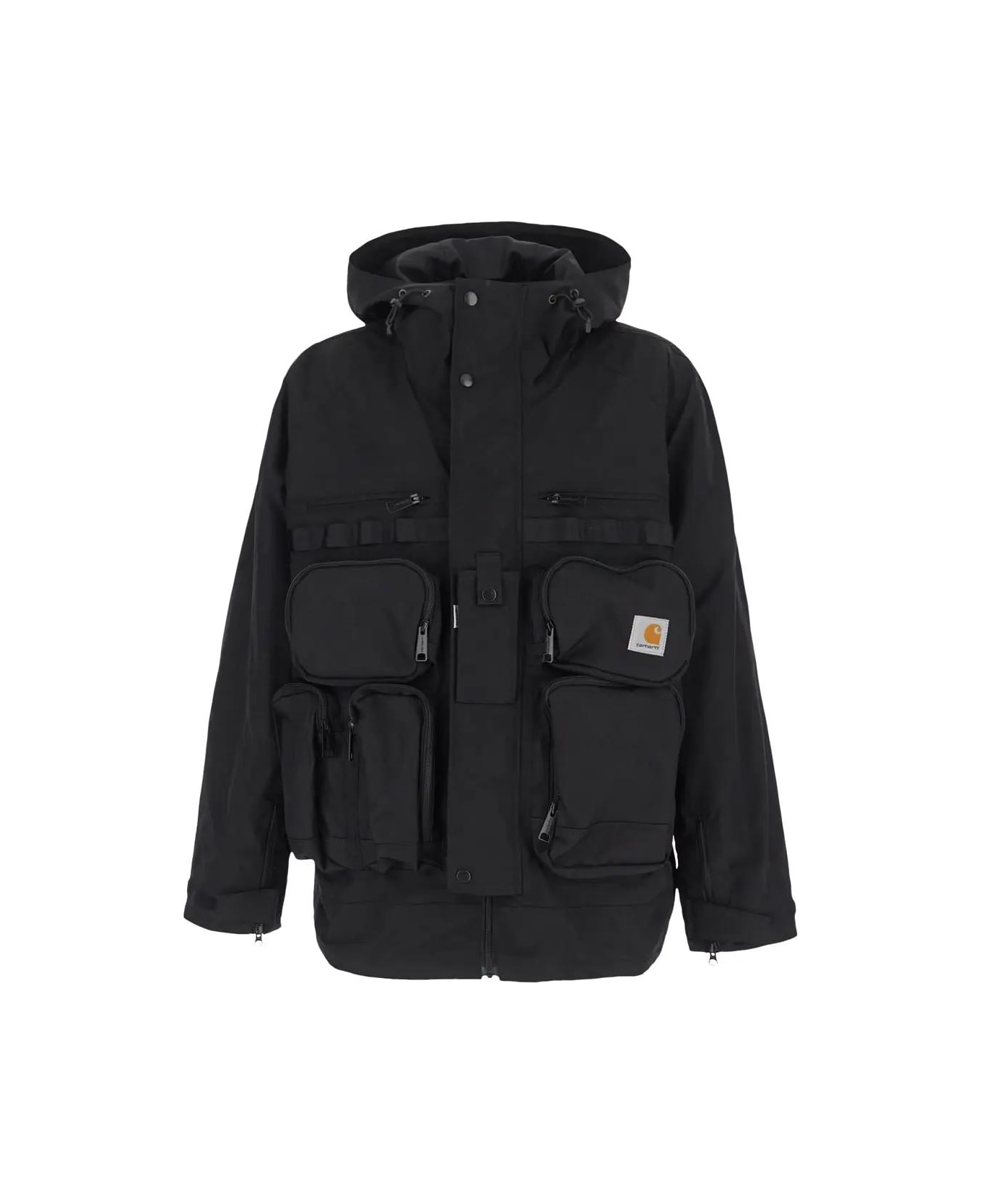 Junya Watanabe jacket in black polyester with multi-pockets design, high neck, hood with drawstring, long raglan sleeves, zip closure, adjustable cuffs with zip slits and rear zipped pockets.