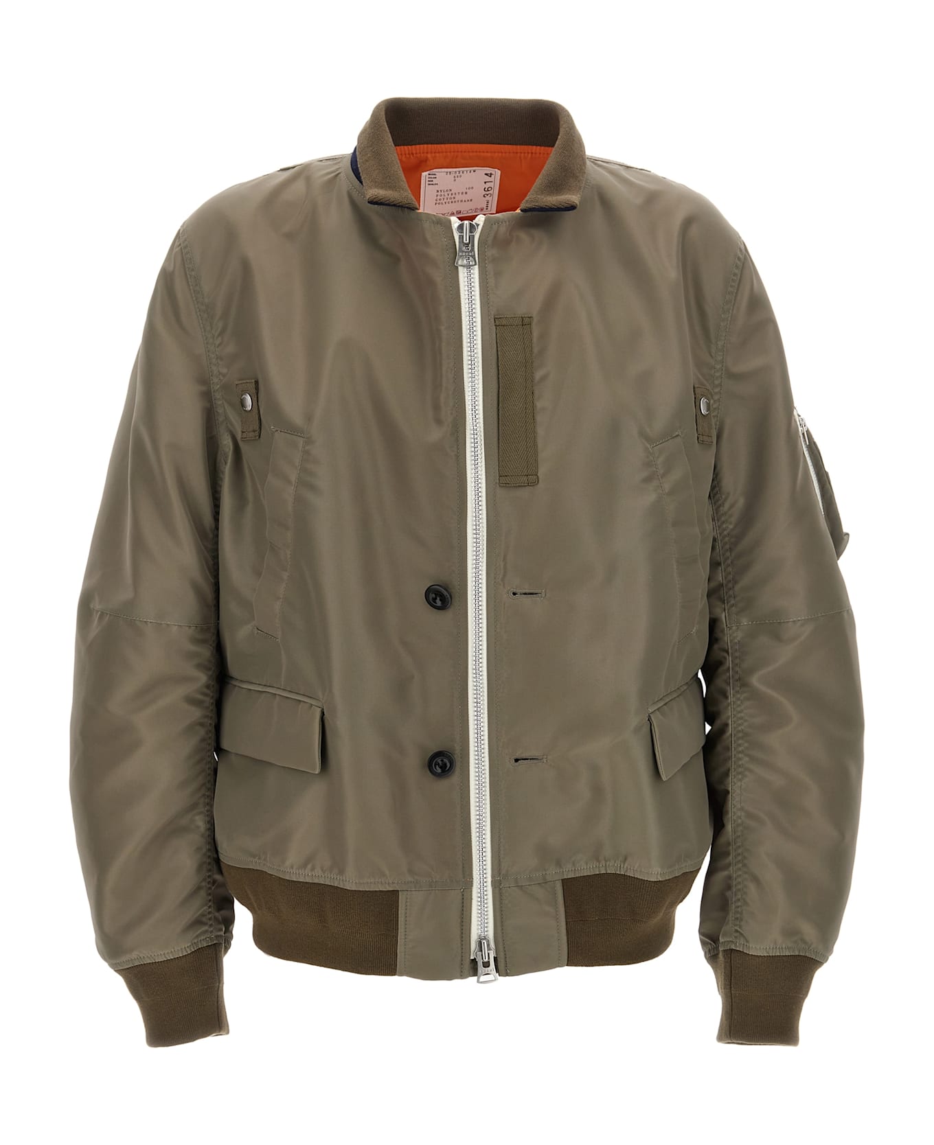 Nylon bomber jacket with tone-on-tone knit details, contrasting lining, possibility of zip or button closure, long cuffed sleeves, pockets. Composition: 100% nylon