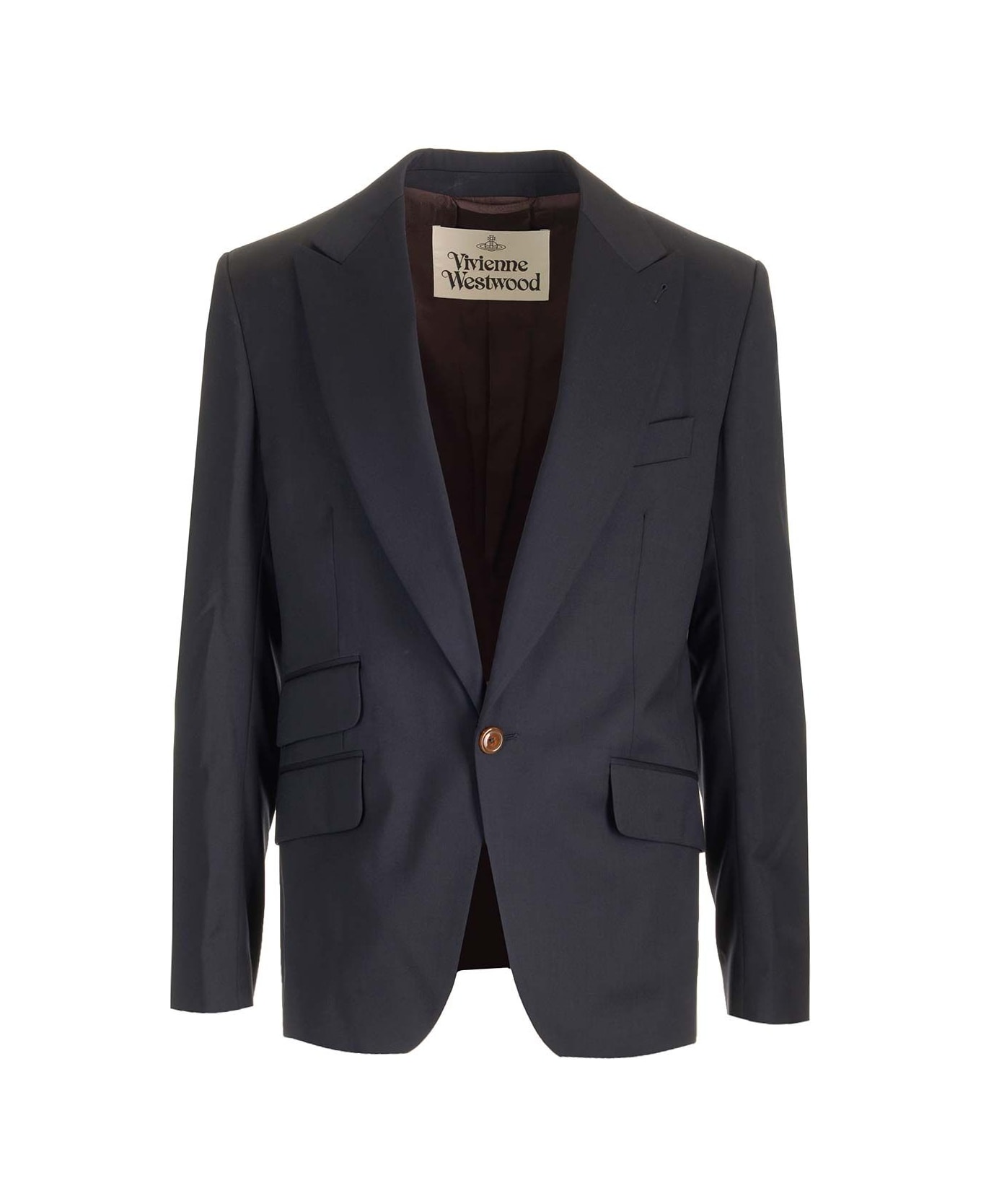 Slim model with peak lapels has a jacquard lining with Orb Single button closure Internal chest pocket Cuffs with buttons Single vent on the back Three front pockets Composition: 100% Virgin wool