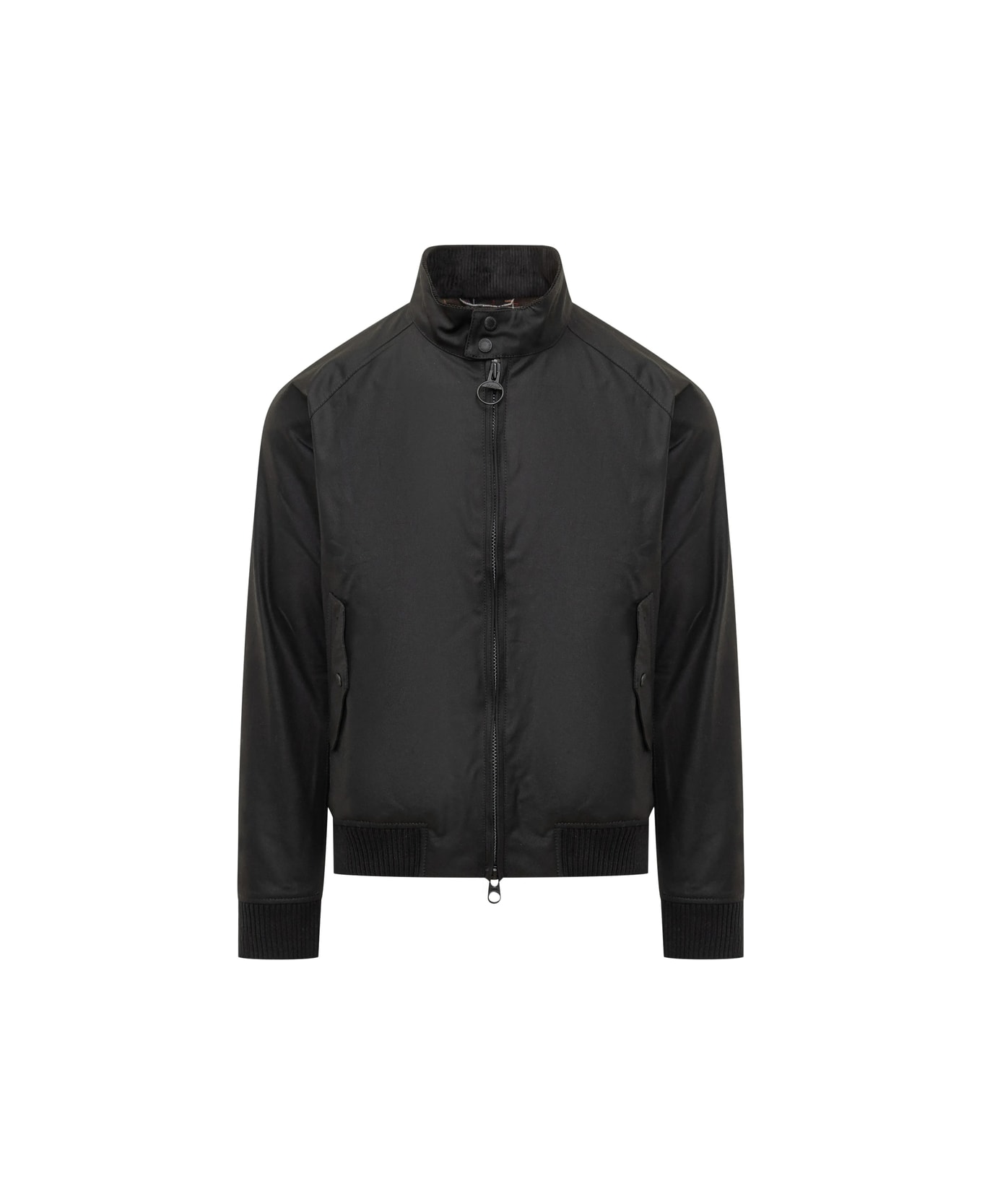 black front two-way zip fastening two side flap pockets ribbed cuffs and hem high neck