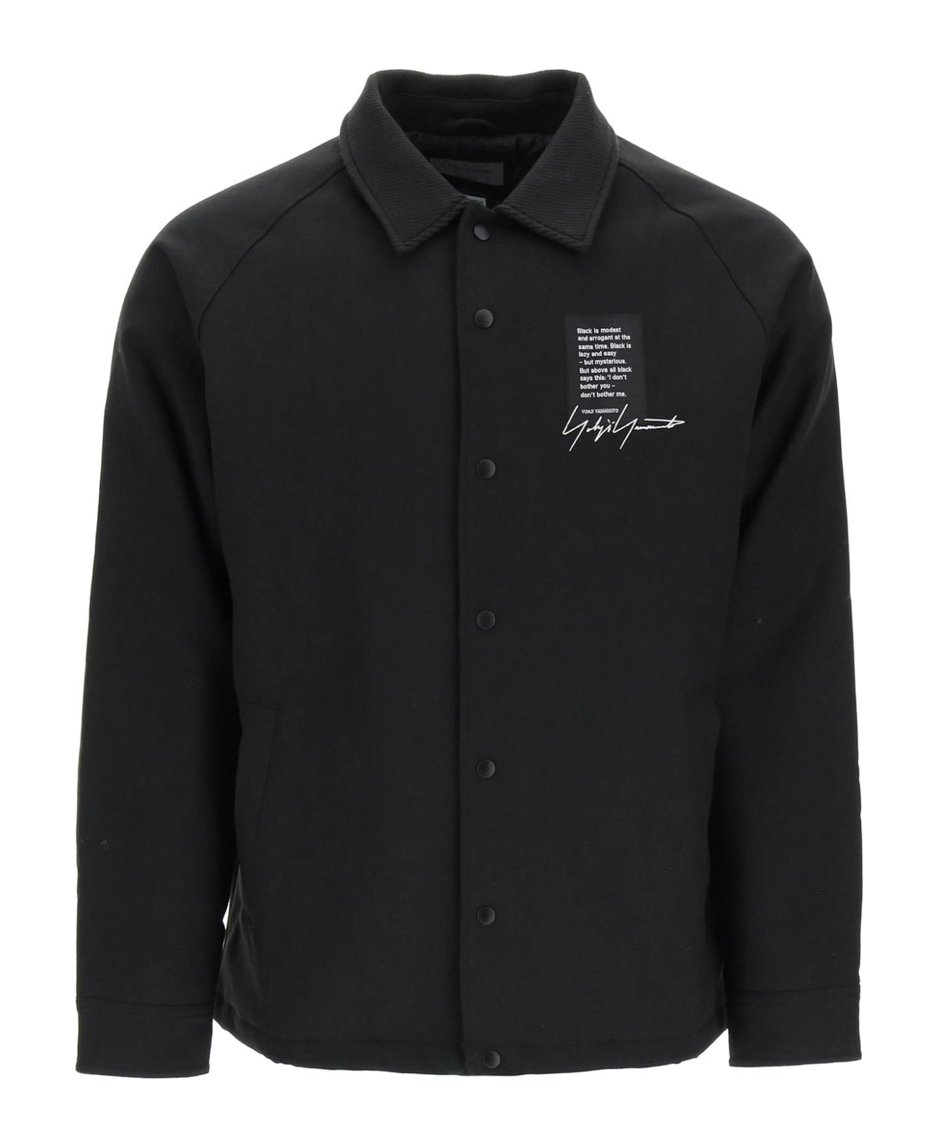 Jacket from the Yohji Yamamoto x New Era capsule collection made of pure wool twill, with logo patch and embroidery at chest and contrasting lettering print on the back. Finished by a logo embroidery on the cuff. It features pointed ribbed-knit collar, snap-button fastening and adjustable cuffs. Provided of side welt pockets, quilted lining and slight polyester padding. The model is 187 cm tall and wears a size L.