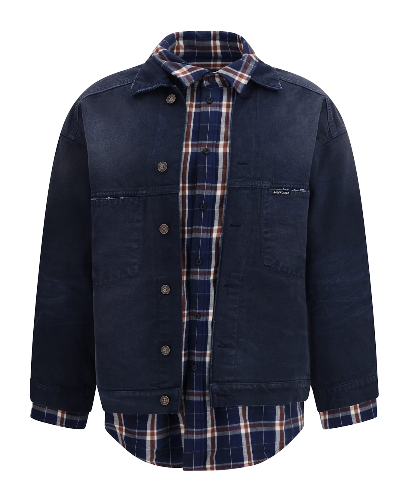 The patched shirt jacket by balenciaga is a bold and innovative piece, crafted from cotton denim with a trompe l' il construction that combines a jacket and a shirt. the two parts are sewn together, creating a unique and contemporary effect. the design features a faded and worn effect, giving the garment a lived-in look. the shirt-style collar and two-button placket, one of which is functional, add elegance, while the chest and slanted pockets offer practicality. the buttons on the cuffs and the adjustable button placket at the waist allow you to customize the fit.